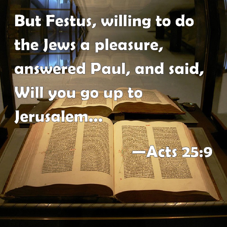 Choose a Background Acts 25:9 But Festus, willing to do the Jews a pleasure, answered Paul, and said, Will you go up to Jerusalem, and there be judged of these things before me? KJV: But Festus, willing to do the Jews a pleasure, answered Paul, and said, Wilt thou go up to Jerusalem, and there be judged of these things before me? DRB: But Festus, willing to shew the Jews a pleasure, answering Paul, said: Wilt thou go up to Jerusalem, and there be judged of these things before me? DBT: But Festus, desirous of obliging the Jews, to acquire their favour, answering Paul, said, Art thou willing to go up to Jerusalem, there to be judged before me concerning these things? ERV: But Festus, desiring to gain favour with the Jews, answered Paul, and said, Wilt thou go up to Jerusalem, and there be judged of these things before me? WBT: But Festus, willing to do the Jews a pleasure, answered Paul, and said, Wilt thou go to Jerusalem, and there be judged concerning these things before me? WEB: But Festus, desiring to gain favor with the Jews, answered Paul and said, "Are you willing to go up to Jerusalem, and be judged by me there concerning these things?" YLT: And Festus willing to lay on the Jews a favour, answering Paul, said, 'Art thou willing, to Jerusalem having gone up, there concerning these things to be judged before me?'Links Acts 25:9 NIV • Acts 25:9 NLT • Acts 25:9 ESV • Acts 25:9 NASB • Acts 25:9 KJV • Acts 25:9 Interlinear • Acts 25:9 Commentaries • Acts 25:9 Parallel Texts • Acts 25:9 Bible Apps • Acts 25:9 Parallel • Bible Hub |