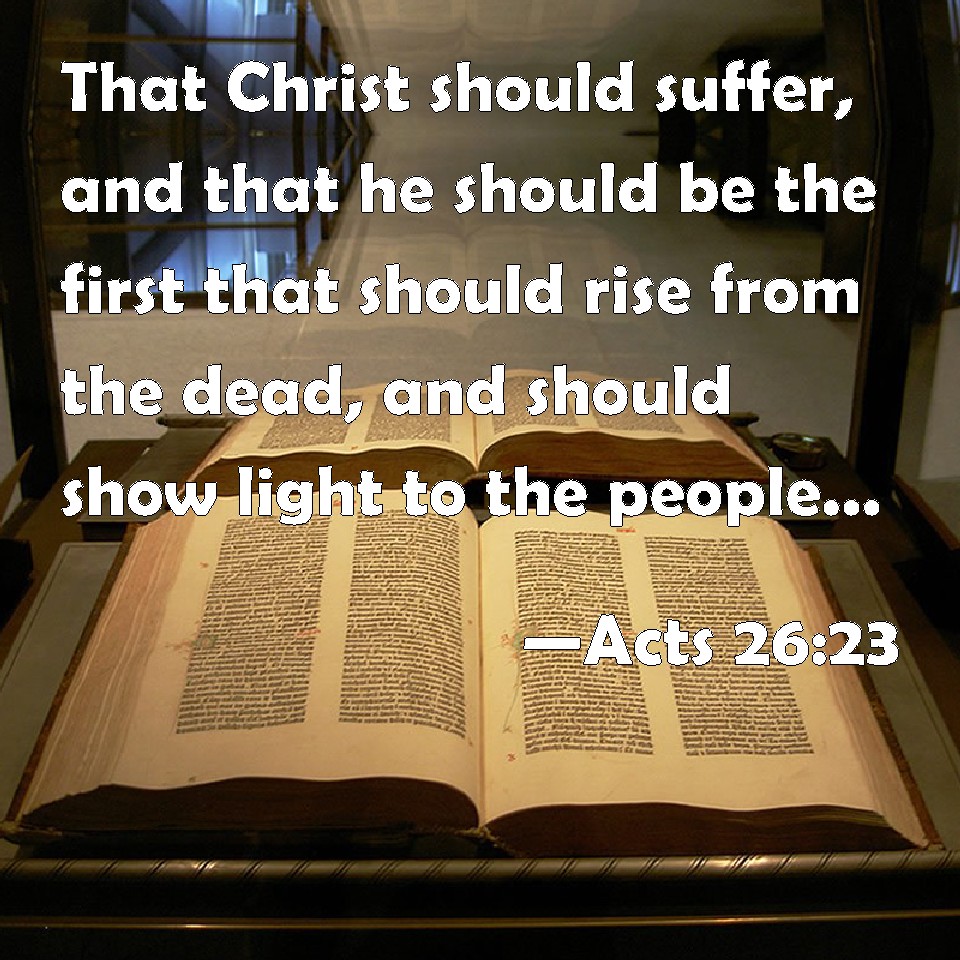Choose a Background Acts 26:23 That Christ should suffer, and that he should be the first that should rise from the dead, and should show light to the people, and to the Gentiles. KJV: That Christ should suffer, and that he should be the first that should rise from the dead, and should shew light unto the people, and to the Gentiles. DRB: That Christ should suffer, and that he should be the first that should rise from the dead, and should shew light to the people, and to the Gentiles. DBT: namely, whether Christ should suffer; whether he first, through resurrection of the dead, should announce light both to the people and to the nations. ERV: how that the Christ must suffer, and how that he first by the resurrection of the dead should proclaim light both to the people and to the Gentiles. WBT: That Christ should suffer, and that he should be the first that should rise from the dead, and should show light to the people, and to the Gentiles. WEB: how the Christ must suffer, and how, by the resurrection of the dead, he would be first to proclaim light both to these people and to the Gentiles." YLT: that the Christ is to suffer, whether first by a rising from the dead, he is about to proclaim light to the people and to the nations.'Links Acts 26:23 NIV • Acts 26:23 NLT • Acts 26:23 ESV • Acts 26:23 NASB • Acts 26:23 KJV • Acts 26:23 Interlinear • Acts 26:23 Commentaries • Acts 26:23 Parallel Texts • Acts 26:23 Bible Apps • Acts 26:23 Parallel • Bible Hub |
