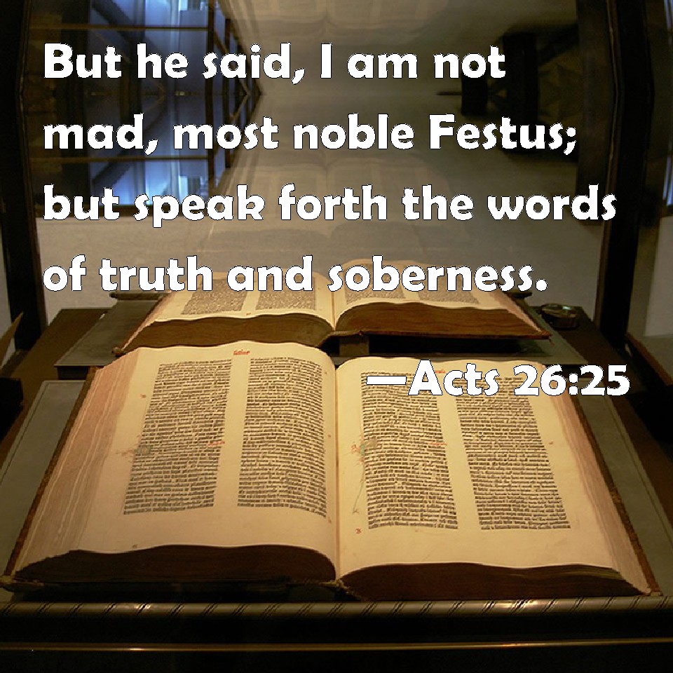 Choose a Background Acts 26:25 But he said, I am not mad, most noble Festus; but speak forth the words of truth and soberness. KJV: But he said, I am not mad, most noble Festus; but speak forth the words of truth and soberness. DRB: And Paul said: I am not mad, most excellent Festus, but I speak words of truth and soberness. DBT: But Paul said, I am not mad, most excellent Festus, but utter words of truth and soberness; ERV: But Paul saith, I am not mad, most excellent Festus; but speak forth words of truth and soberness. WBT: But he said, I am not insane, most noble Festus; but speak forth the words of truth and soberness. WEB: But he said, "I am not crazy, most excellent Festus, but boldly declare words of truth and reasonableness. YLT: and he saith, 'I am not mad, most noble Festus, but of truth and soberness the sayings I speak forth;Links Acts 26:25 NIV • Acts 26:25 NLT • Acts 26:25 ESV • Acts 26:25 NASB • Acts 26:25 KJV • Acts 26:25 Interlinear • Acts 26:25 Commentaries • Acts 26:25 Parallel Texts • Acts 26:25 Bible Apps • Acts 26:25 Parallel • Bible Hub |