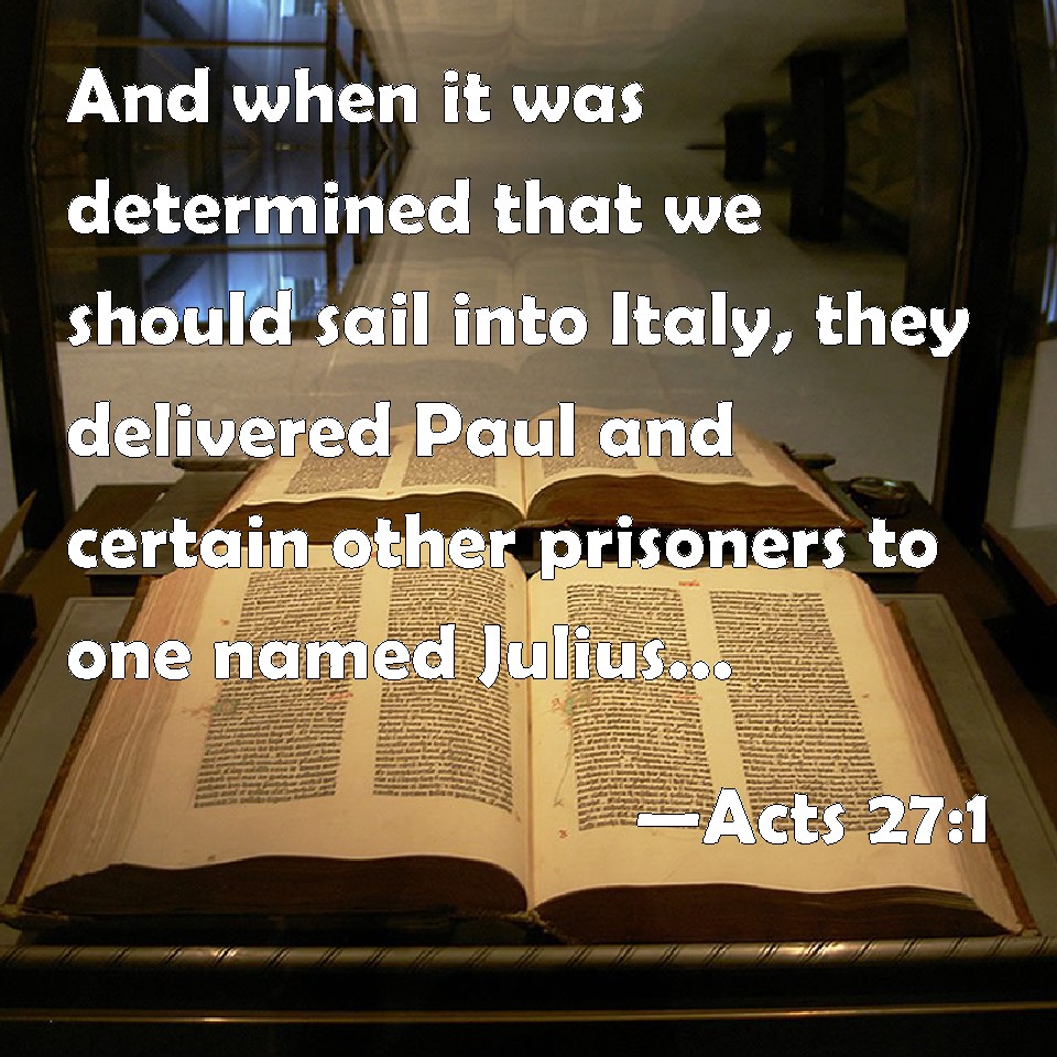 Choose a Background Acts 27:1 And when it was determined that we should sail into Italy, they delivered Paul and certain other prisoners to one named Julius, a centurion of Augustus' band. KJV: And when it was determined that we should sail into Italy, they delivered Paul and certain other prisoners unto one named Julius, a centurion of Augustus' band. DRB: AND when it was determined that he should sail into Italy, and that Paul, with the other prisoners, should be delivered to a centurion, named Julius, of the band Augusta, DBT: But when it had been determined that we should sail to Italy, they delivered up Paul and certain other prisoners to a centurion, by name Julius, of Augustus' company. ERV: And when it was determined that we should sail for Italy, they delivered Paul and certain other prisoners to a centurion named Julius, of the Augustan band. WBT: And when it was determined that we should sail into Italy, they delivered Paul and certain other prisoners to one named Julius, a centurion of Augustus' band. WEB: When it was determined that we should sail for Italy, they delivered Paul and certain other prisoners to a centurion named Julius, of the Augustan band. YLT: And when our sailing to Italy was determined, they were delivering up both Paul and certain others, prisoners, to a centurion, by name Julius, of the band of Sebastus,Links Acts 27:1 NIV • Acts 27:1 NLT • Acts 27:1 ESV • Acts 27:1 NASB • Acts 27:1 KJV • Acts 27:1 Interlinear • Acts 27:1 Commentaries • Acts 27:1 Parallel Texts • Acts 27:1 Bible Apps • Acts 27:1 Parallel • Bible Hub |