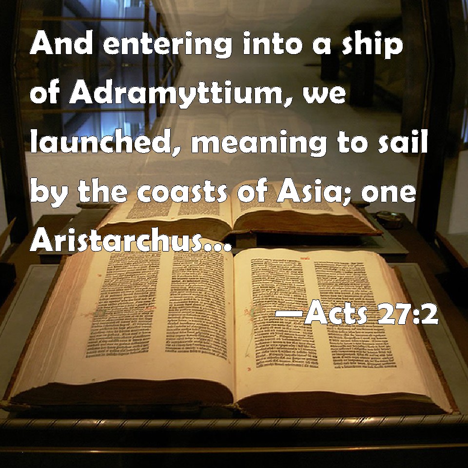 Choose a Background Acts 27:2 And entering into a ship of Adramyttium, we launched, meaning to sail by the coasts of Asia; one Aristarchus, a Macedonian of Thessalonica, being with us. KJV: And entering into a ship of Adramyttium, we launched, meaning to sail by the coasts of Asia; one Aristarchus, a Macedonian of Thessalonica, being with us. DRB: Going on board a ship of Adrumetum, we launched, meaning to sail by the coasts of Asia, Aristarchus, the Macedonian of Thessalonica, continuing with us. DBT: And going on board a ship of Adramyttium about to navigate by the places along Asia, we set sail, Aristarchus, a Macedonian of Thessalonica, being with us. ERV: And embarking in a ship of Adramyttium, which was about to sail unto the places on the coast of Asia, we put to sea, Aristarchus, a Macedonian of Thessalonica, being with us. WBT: And entering into a ship of Adramyttium, we lanched, meaning to sail by the coasts of Asia, one Aristarchus, a Macedonian of Thessalonica, being with us. WEB: Embarking in a ship of Adramyttium, which was about to sail to places on the coast of Asia, we put to sea; Aristarchus, a Macedonian of Thessalonica, being with us. YLT: and having embarked in a ship of Adramyttium, we, being about to sail by the coasts of Asia, did set sail, there being with us Aristarchus, a Macedonian of Thessalonica,Links Acts 27:2 NIV • Acts 27:2 NLT • Acts 27:2 ESV • Acts 27:2 NASB • Acts 27:2 KJV • Acts 27:2 Interlinear • Acts 27:2 Commentaries • Acts 27:2 Parallel Texts • Acts 27:2 Bible Apps • Acts 27:2 Parallel • Bible Hub |