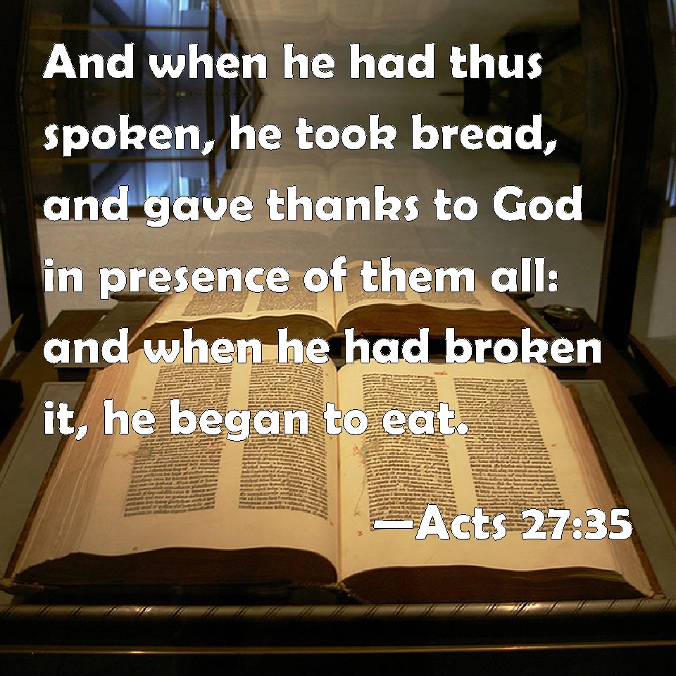 Choose a Background Acts 27:35 And when he had thus spoken, he took bread, and gave thanks to God in presence of them all: and when he had broken it, he began to eat. KJV: And when he had thus spoken, he took bread, and gave thanks to God in presence of them all: and when he had broken it, he began to eat. DRB: And when he had said these things, taking bread, he gave thanks to God in the sight of them all; and when he had broken it, he began to eat. DBT: And, having said these things and taken a loaf, he gave thanks to God before all, and having broken it began to eat. ERV: And when he had said this, and had taken bread, he gave thanks to God in the presence of all: and he brake it, and began to eat. WBT: And when he had thus spoken, he took bread, and gave thanks to God in presence of them all; and when he had broken it, he began to eat. WEB: When he had said this, and had taken bread, he gave thanks to God in the presence of all, and he broke it, and began to eat. YLT: and having said these things, and having taken bread, he gave thanks to God before all, and having broken it, he began to eat;Links Acts 27:35 NIV • Acts 27:35 NLT • Acts 27:35 ESV • Acts 27:35 NASB • Acts 27:35 KJV • Acts 27:35 Interlinear • Acts 27:35 Commentaries • Acts 27:35 Parallel Texts • Acts 27:35 Bible Apps • Acts 27:35 Parallel • Bible Hub |