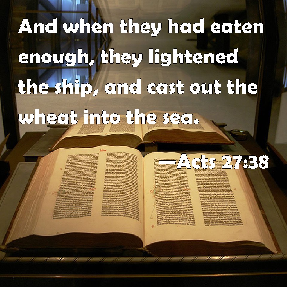 Choose a Background Acts 27:38 And when they had eaten enough, they lightened the ship, and cast out the wheat into the sea. KJV: And when they had eaten enough, they lightened the ship, and cast out the wheat into the sea. DRB: And when they had eaten enough, they lightened the ship, casting the wheat into the sea. DBT: And having satisfied themselves with food, they lightened the ship, casting out the wheat into the sea. ERV: And when they had eaten enough, they lightened the ship, throwing out the wheat into the sea. WBT: And when they had eaten enough, they lightened the ship, and cast the wheat into the sea. WEB: When they had eaten enough, they lightened the ship, throwing out the wheat into the sea. YLT: and having eaten sufficient nourishment, they were lightening the ship, casting forth the wheat into the sea.Links Acts 27:38 NIV • Acts 27:38 NLT • Acts 27:38 ESV • Acts 27:38 NASB • Acts 27:38 KJV • Acts 27:38 Interlinear • Acts 27:38 Commentaries • Acts 27:38 Parallel Texts • Acts 27:38 Bible Apps • Acts 27:38 Parallel • Bible Hub |