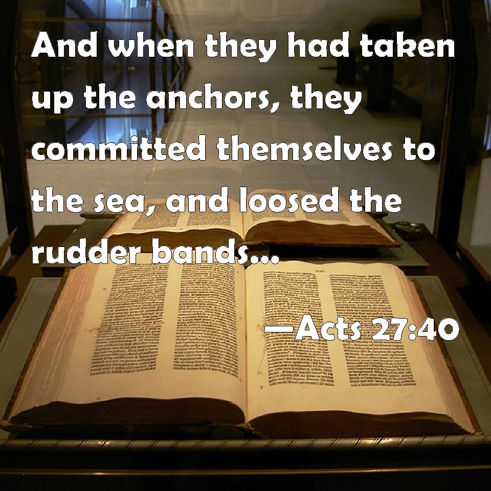Choose a Background Acts 27:40 And when they had taken up the anchors, they committed themselves to the sea, and loosed the rudder bands, and hoisted up the mainsail to the wind, and made toward shore. KJV: And when they had taken up the anchors, they committed themselves unto the sea, and loosed the rudder bands, and hoised up the mainsail to the wind, and made toward shore. DRB: And when they had taken up the anchors, they committed themselves to the sea, loosing withal the rudder bands; and hoisting up the mainsail to the wind, they made towards shore. DBT: and, having cast off the anchors, they left them in the sea, at the same time loosening the lashings of the rudders, and hoisting the foresail to the wind, they made for the strand. ERV: And casting off the anchors, they left them in the sea, at the same time loosing the bands of the rudders; and hoisting up the foresail to the wind, they made for the beach. WBT: And when they had taken up the anchors, they committed themselves to the sea, and loosed the rudder bands, and hoisted the mainsail to the wind, and made towards the shore. WEB: Casting off the anchors, they left them in the sea, at the same time untying the rudder ropes. Hoisting up the foresail to the wind, they made for the beach. YLT: and the anchors having taken up, they were committing it to the sea, at the same time — having loosed the bands of the rudders, and having hoisted up the mainsail to the wind — they were making for the shore,Links Acts 27:40 NIV • Acts 27:40 NLT • Acts 27:40 ESV • Acts 27:40 NASB • Acts 27:40 KJV • Acts 27:40 Interlinear • Acts 27:40 Commentaries • Acts 27:40 Parallel Texts • Acts 27:40 Bible Apps • Acts 27:40 Parallel • Bible Hub |