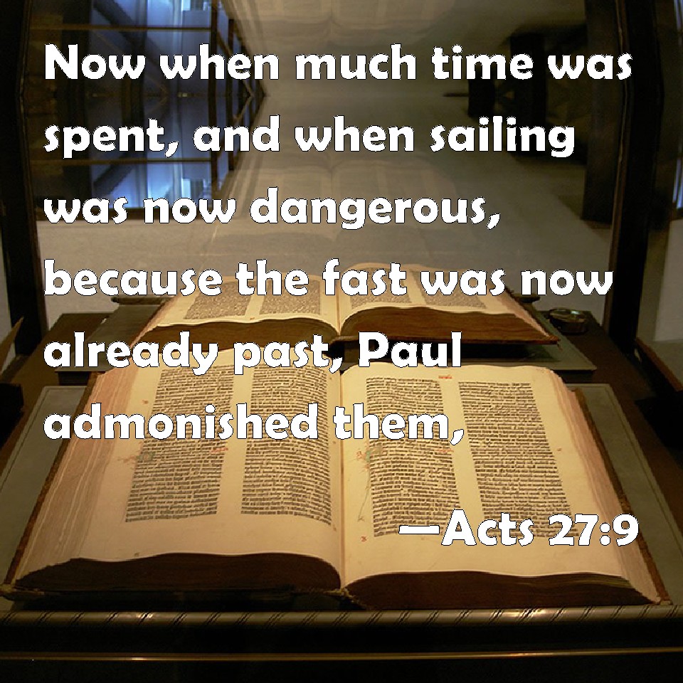 Choose a Background Acts 27:9 Now when much time was spent, and when sailing was now dangerous, because the fast was now already past, Paul admonished them, KJV: Now when much time was spent, and when sailing was now dangerous, because the fast was now already past, Paul admonished them, DRB: And when much time was spent, and when sailing now was dangerous, because the fast was now past, Paul comforted them, DBT: And much time having now been spent, and navigation being already dangerous, because the fast also was already past, Paul counselled them, ERV: And when much time was spent, and the voyage was now dangerous, because the Fast was now already gone by, Paul admonished them, WBT: Now when much time was spent, and when sailing was now dangerous, because the fast was now already past, Paul admonished them. WEB: When much time had passed and the voyage was now dangerous, because the Fast had now already gone by, Paul admonished them, YLT: And much time being spent, and the sailing being now dangerous — because of the fast also being already past — Paul was admonishing,Links Acts 27:9 NIV • Acts 27:9 NLT • Acts 27:9 ESV • Acts 27:9 NASB • Acts 27:9 KJV • Acts 27:9 Interlinear • Acts 27:9 Commentaries • Acts 27:9 Parallel Texts • Acts 27:9 Bible Apps • Acts 27:9 Parallel • Bible Hub |