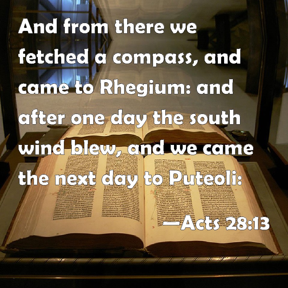Choose a Background Acts 28:13 And from there we fetched a compass, and came to Rhegium: and after one day the south wind blew, and we came the next day to Puteoli: KJV: And from thence we fetched a compass, and came to Rhegium: and after one day the south wind blew, and we came the next day to Puteoli: DRB: From thence, compassing by the shore, we came to Rhegium: and after one day, the south wind blowing, we came the second day to Puteoli; DBT: Whence, going in a circuitous course, we arrived at Rhegium; and after one day, the wind having changed to south, on the second day we came to Puteoli, ERV: And from thence we made a circuit, and arrived at Rhegium: and after one day a south wind sprang up, and on the second day we came to Puteoli: WBT: And from thence we made a circuit, and came to Rhegium: and after one day the south wind blew, and we came the next day to Puteoli: WEB: From there we circled around and arrived at Rhegium. After one day, a south wind sprang up, and on the second day we came to Puteoli, YLT: thence having gone round, we came to Rhegium, and after one day, a south wind having sprung up, the second day we came to Puteoli;Links Acts 28:13 NIV • Acts 28:13 NLT • Acts 28:13 ESV • Acts 28:13 NASB • Acts 28:13 KJV • Acts 28:13 Interlinear • Acts 28:13 Commentaries • Acts 28:13 Parallel Texts • Acts 28:13 Bible Apps • Acts 28:13 Parallel • Bible Hub |