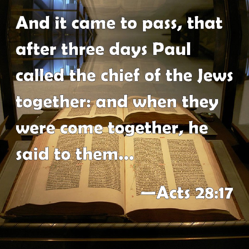 Choose a Background Acts 28:17 And it came to pass, that after three days Paul called the chief of the Jews together: and when they were come together, he said to them, Men and brothers, though I have committed nothing against the people, or customs of our fathers, yet was I delivered prisoner from Jerusalem into the hands of the Romans. KJV: And it came to pass, that after three days Paul called the chief of the Jews together: and when they were come together, he said unto them, Men and brethren, though I have committed nothing against the people, or customs of our fathers, yet was I delivered prisoner from Jerusalem into the hands of the Romans. DRB: And after the third day, he called together the chief of the Jews. And when they were assembled, he said to them: Men, brethren, I, having done nothing against the people, or the custom of our fathers, was delivered prisoner from Jerusalem into the hands of the Romans; DBT: And it came to pass after three days, that he called together those who were the chief of the Jews; and when they had come together he said to them, Brethren, I having done nothing against the people or the customs of our forefathers, have been delivered a prisoner from Jerusalem into the hands of the Romans, ERV: And it came to pass, that after three days he called together those that were the chief of the Jews: and when they were come together, he said unto them, I, brethren, though I had done nothing against the people, or the customs of our fathers, yet was delivered prisoner from Jerusalem into the hands of the Romans: WBT: And it came to pass, that after three days, Paul called together the chief of the Jews. And when they were assembled, he said to them, Men, brethren, though I have committed nothing against the people, or customs of our fathers, yet I was delivered prisoner from Jerusalem into the hands of the Romans. WEB: It happened that after three days Paul called together those who were the leaders of the Jews. When they had come together, he said to them, "I, brothers, though I had done nothing against the people, or the customs of our fathers, still was delivered prisoner from Jerusalem into the hands of the Romans, YLT: And it came to pass after three days, Paul called together those who are the principal men of the Jews, and they having come together, he said unto them: 'Men, brethren, I — having done nothing contrary to the people, or to the customs of the fathers — a prisoner from Jerusalem, was delivered up to the hands of the Romans;Links Acts 28:17 NIV • Acts 28:17 NLT • Acts 28:17 ESV • Acts 28:17 NASB • Acts 28:17 KJV • Acts 28:17 Interlinear • Acts 28:17 Commentaries • Acts 28:17 Parallel Texts • Acts 28:17 Bible Apps • Acts 28:17 Parallel • Bible Hub |