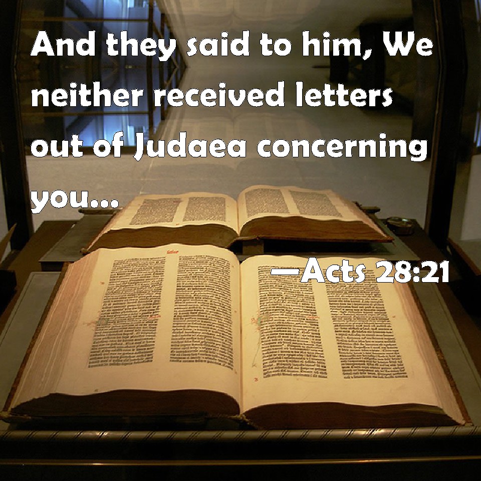 Choose a Background Acts 28:21 And they said to him, We neither received letters out of Judaea concerning you, neither any of the brothers that came showed or spoke any harm of you. KJV: And they said unto him, We neither received letters out of Judaea concerning thee, neither any of the brethren that came shewed or spake any harm of thee. DRB: But they said to him: We neither received letters concerning thee from Judea, neither did any of the brethren that came hither, relate or speak any evil of thee. DBT: And they said to him, For our part, we have neither received letters from Judaea concerning thee, nor has any one of the brethren who has arrived reported or said anything evil concerning thee. ERV: And they said unto him, We neither received letters from Judaea concerning thee, nor did any of the brethren come hither and report or speak any harm of thee. WBT: And they said to him, We have neither received letters from Judea concerning thee, neither have any of the brethren that came shown or spoken any harm of thee. WEB: They said to him, "We neither received letters from Judea concerning you, nor did any of the brothers come here and report or speak any evil of you. YLT: And they said unto him, 'We did neither receive letters concerning thee from Judea, nor did any one who came of the brethren declare or speak any evil concerning thee,Links Acts 28:21 NIV • Acts 28:21 NLT • Acts 28:21 ESV • Acts 28:21 NASB • Acts 28:21 KJV • Acts 28:21 Interlinear • Acts 28:21 Commentaries • Acts 28:21 Parallel Texts • Acts 28:21 Bible Apps • Acts 28:21 Parallel • Bible Hub |