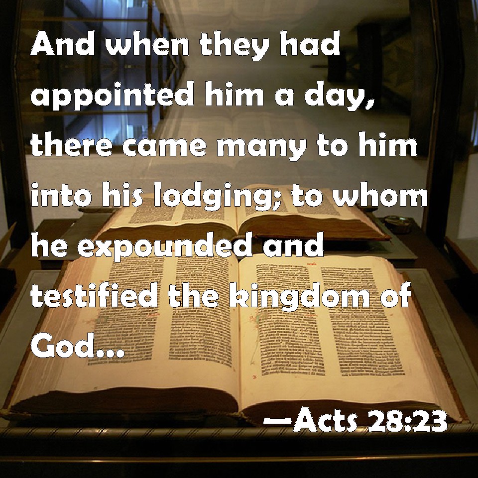 Choose a Background Acts 28:23 And when they had appointed him a day, there came many to him into his lodging; to whom he expounded and testified the kingdom of God, persuading them concerning Jesus, both out of the law of Moses, and out of the prophets, from morning till evening. KJV: And when they had appointed him a day, there came many to him into his lodging; to whom he expounded and testified the kingdom of God, persuading them concerning Jesus, both out of the law of Moses, and out of the prophets, from morning till evening. DRB: And when they had appointed him a day, there came very many to him unto his lodgings; to whom he expounded, testifying the kingdom of God, and persuading them concerning Jesus, out of the law of Moses and the prophets, from morning until evening. DBT: And having appointed him a day many came to him to the lodging, to whom he expounded, testifying of the kingdom of God, and persuading them concerning Jesus, both from the law of Moses and the prophets, from early morning to evening. ERV: And when they had appointed him a day, they came to him into his lodging in great number; to whom he expounded the matter, testifying the kingdom of God, and persuading them concerning Jesus, both from the law of Moses and from the prophets, from morning till evening. WBT: And when they had appointed him a day, there came many to him into his lodging; to whom he expounded and testified the kingdom of God, persuading them concerning Jesus, both out of the law of Moses, and out of the prophets, from morning till evening. WEB: When they had appointed him a day, many people came to him at his lodging. He explained to them, testifying about the Kingdom of God, and persuading them concerning Jesus, both from the law of Moses and from the prophets, from morning until evening. YLT: and having appointed him a day, they came, more of them unto him, to the lodging, to whom he was expounding, testifying fully the reign of God, persuading them also of the things concerning Jesus, both from the law of Moses, and the prophets, from morning till evening,Links Acts 28:23 NIV • Acts 28:23 NLT • Acts 28:23 ESV • Acts 28:23 NASB • Acts 28:23 KJV • Acts 28:23 Interlinear • Acts 28:23 Commentaries • Acts 28:23 Parallel Texts • Acts 28:23 Bible Apps • Acts 28:23 Parallel • Bible Hub |