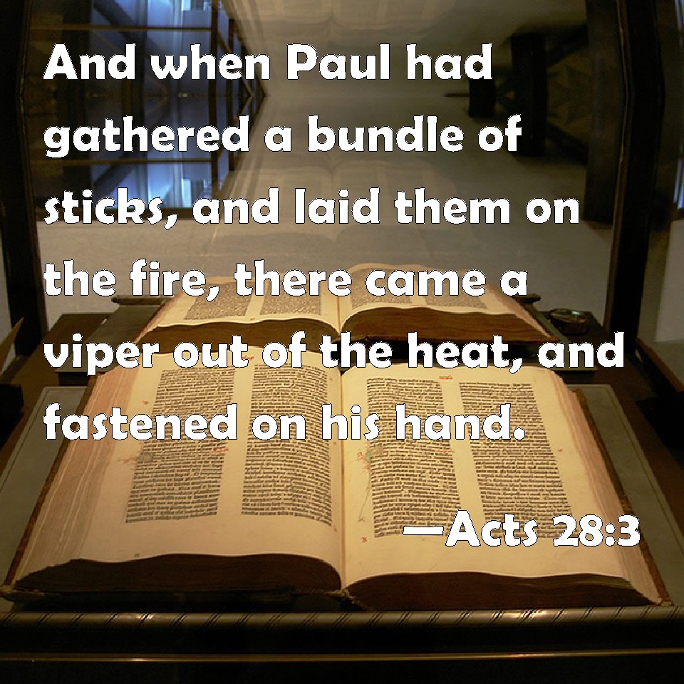 Choose a Background Acts 28:3 And when Paul had gathered a bundle of sticks, and laid them on the fire, there came a viper out of the heat, and fastened on his hand. KJV: And when Paul had gathered a bundle of sticks, and laid them on the fire, there came a viper out of the heat, and fastened on his hand. DRB: And when Paul had gathered together a bundle of sticks, and had laid them on the fire, a viper coming out of the heat, fastened on his hand. DBT: And Paul having gathered a certain quantity of sticks together in a bundle and laid it on the fire, a viper coming out from the heat seized his hand. ERV: But when Paul had gathered a bundle of sticks, and laid them on the fire, a viper came out by reason of the heat, and fastened on his hand. WBT: And when Paul had gathered a bundle of sticks, and laid them on the fire, there came a viper out of the heat, and fastened on his hand. WEB: But when Paul had gathered a bundle of sticks and laid them on the fire, a viper came out because of the heat, and fastened on his hand. YLT: but Paul having gathered together a quantity of sticks, and having laid them upon the fire, a viper — out of the heat having come — did fasten on his hand.Links Acts 28:3 NIV • Acts 28:3 NLT • Acts 28:3 ESV • Acts 28:3 NASB • Acts 28:3 KJV • Acts 28:3 Interlinear • Acts 28:3 Commentaries • Acts 28:3 Parallel Texts • Acts 28:3 Bible Apps • Acts 28:3 Parallel • Bible Hub |