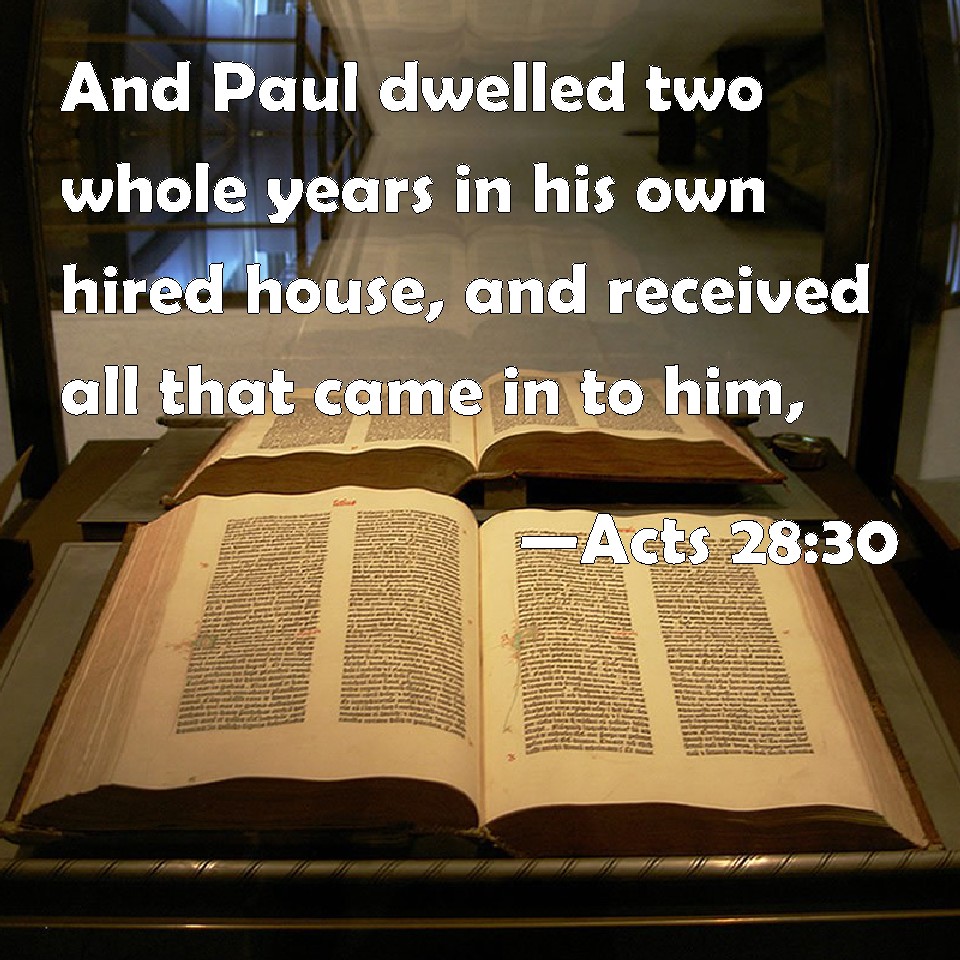Choose a Background Acts 28:30 And Paul dwelled two whole years in his own hired house, and received all that came in to him, KJV: And Paul dwelt two whole years in his own hired house, and received all that came in unto him, DRB: And he remained two whole years in his own hired lodging; and he received all that came in to him, DBT: And he remained two whole years in his own hired lodging, and received all who came to him, ERV: And he abode two whole years in his own hired dwelling, and received all that went in unto him, WBT: And Paul dwelt two whole years in his own hired house, and received all that came in to him, WEB: Paul stayed two whole years in his own rented house, and received all who were coming to him, YLT: and Paul remained an entire two years in his own hired house, and was receiving all those coming in unto him,Links Acts 28:30 NIV • Acts 28:30 NLT • Acts 28:30 ESV • Acts 28:30 NASB • Acts 28:30 KJV • Acts 28:30 Interlinear • Acts 28:30 Commentaries • Acts 28:30 Parallel Texts • Acts 28:30 Bible Apps • Acts 28:30 Parallel • Bible Hub |