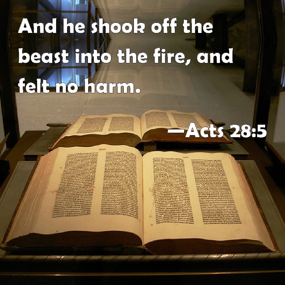 Choose a Background Acts 28:5 And he shook off the beast into the fire, and felt no harm. KJV: And he shook off the beast into the fire, and felt no harm. DRB: And he indeed shaking off the beast into the fire, suffered no harm. DBT: He however, having shaken off the beast into the fire, felt no harm. ERV: Howbeit he shook off the beast into the fire, and took no harm. WBT: And he shook off the animal into the fire, and felt no harm. WEB: However he shook off the creature into the fire, and wasn't harmed. YLT: he then, indeed, having shaken off the beast into the fire, suffered no evil,Links Acts 28:5 NIV • Acts 28:5 NLT • Acts 28:5 ESV • Acts 28:5 NASB • Acts 28:5 KJV • Acts 28:5 Interlinear • Acts 28:5 Commentaries • Acts 28:5 Parallel Texts • Acts 28:5 Bible Apps • Acts 28:5 Parallel • Bible Hub |