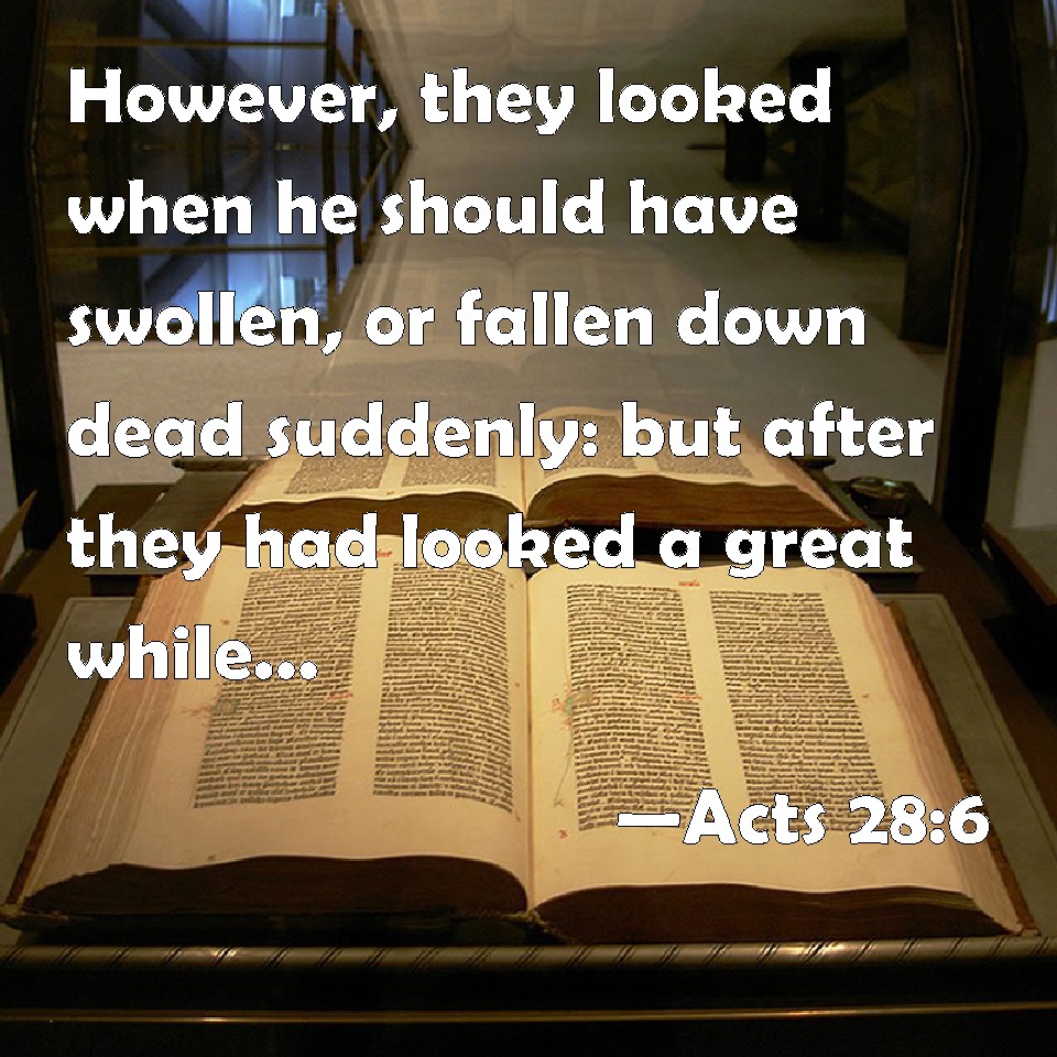 Choose a Background Acts 28:6 However, they looked when he should have swollen, or fallen down dead suddenly: but after they had looked a great while, and saw no harm come to him, they changed their minds, and said that he was a god. KJV: Howbeit they looked when he should have swollen, or fallen down dead suddenly: but after they had looked a great while, and saw no harm come to him, they changed their minds, and said that he was a god. DRB: But they supposed that he would begin to swell up, and that he would suddenly fall down and die. But expecting long, and seeing that there came no harm to him, changing their minds, they said, that he was a god. DBT: But they expected that he would have swollen or fallen down suddenly dead. But when they had expected a long time and saw nothing unusual happen to him, changing their opinion, they said he was a god. ERV: But they expected that he would have swollen, or fallen down dead suddenly: but when they were long in expectation, and beheld nothing amiss came to him, they changed their minds, and said that he was a god. WBT: Yet they looked when he would have swelled, or fallen down dead suddenly: but after they had looked a great while, and saw no harm come to him, they changed their minds, and said that he was a god. WEB: But they expected that he would have swollen or fallen down dead suddenly, but when they watched for a long time and saw nothing bad happen to him, they changed their minds, and said that he was a god. YLT: and they were expecting him to be about to be inflamed, or to fall down suddenly dead, and they, expecting it a long time, and seeing nothing uncommon happening to him, changing their minds, said he was a god.Links Acts 28:6 NIV • Acts 28:6 NLT • Acts 28:6 ESV • Acts 28:6 NASB • Acts 28:6 KJV • Acts 28:6 Interlinear • Acts 28:6 Commentaries • Acts 28:6 Parallel Texts • Acts 28:6 Bible Apps • Acts 28:6 Parallel • Bible Hub |