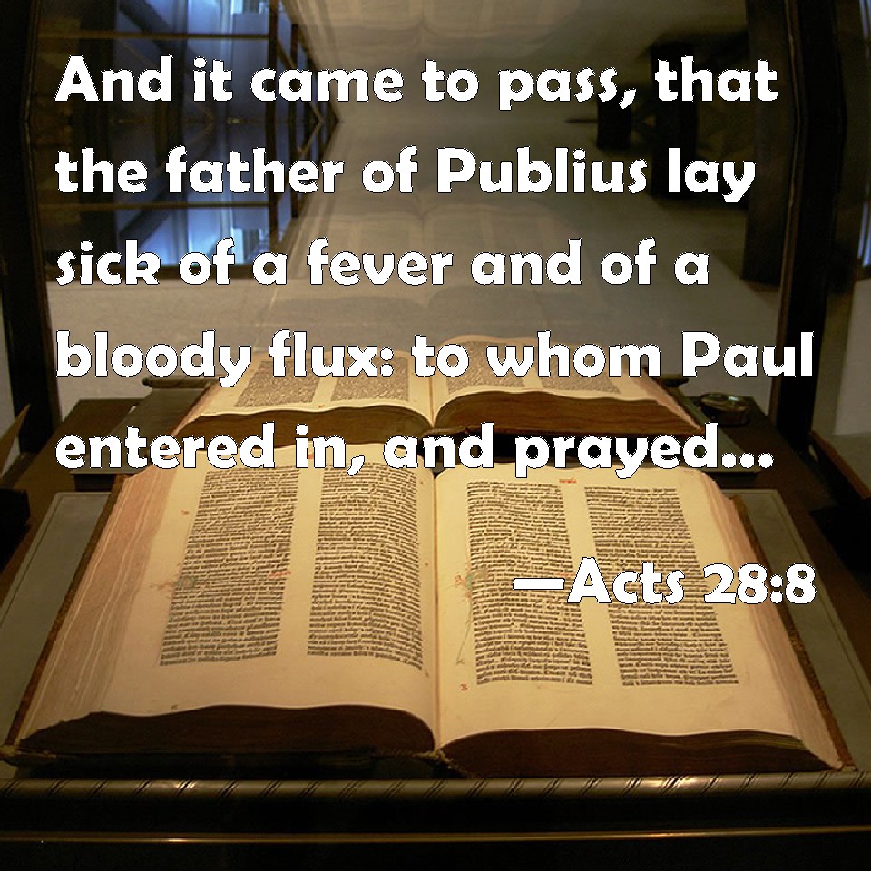 Choose a Background Acts 28:8 And it came to pass, that the father of Publius lay sick of a fever and of a bloody flux: to whom Paul entered in, and prayed, and laid his hands on him, and healed him. KJV: And it came to pass, that the father of Publius lay sick of a fever and of a bloody flux: to whom Paul entered in, and prayed, and laid his hands on him, and healed him. DRB: And it happened that the father of Publius lay sick of a fever, and of a bloody flux. To whom Paul entered in; and when he had prayed, and laid his hands on him, he healed him. DBT: And it happened that the father of Publius lay ill of fever and dysentery; to whom Paul entered in, and having prayed and laid his hands on him cured him. ERV: And it was so, that the father of Publius lay sick of fever and dysentery: unto whom Paul entered in, and prayed, and laying his hands on him healed him. WBT: And it came to pass that the father of Publius lay sick with a fever, and a bloody-flux: to whom Paul entered in, and prayed, and laid his hands on him, and healed him. WEB: It happened that the father of Publius lay sick of fever and dysentery. Paul entered in to him, prayed, and laying his hands on him, healed him. YLT: and it came to pass, the father of Publius with feverish heats and dysentery pressed, was laid, unto whom Paul having entered, and having prayed, having laid his hands on him, healed him;Links Acts 28:8 NIV • Acts 28:8 NLT • Acts 28:8 ESV • Acts 28:8 NASB • Acts 28:8 KJV • Acts 28:8 Interlinear • Acts 28:8 Commentaries • Acts 28:8 Parallel Texts • Acts 28:8 Bible Apps • Acts 28:8 Parallel • Bible Hub |