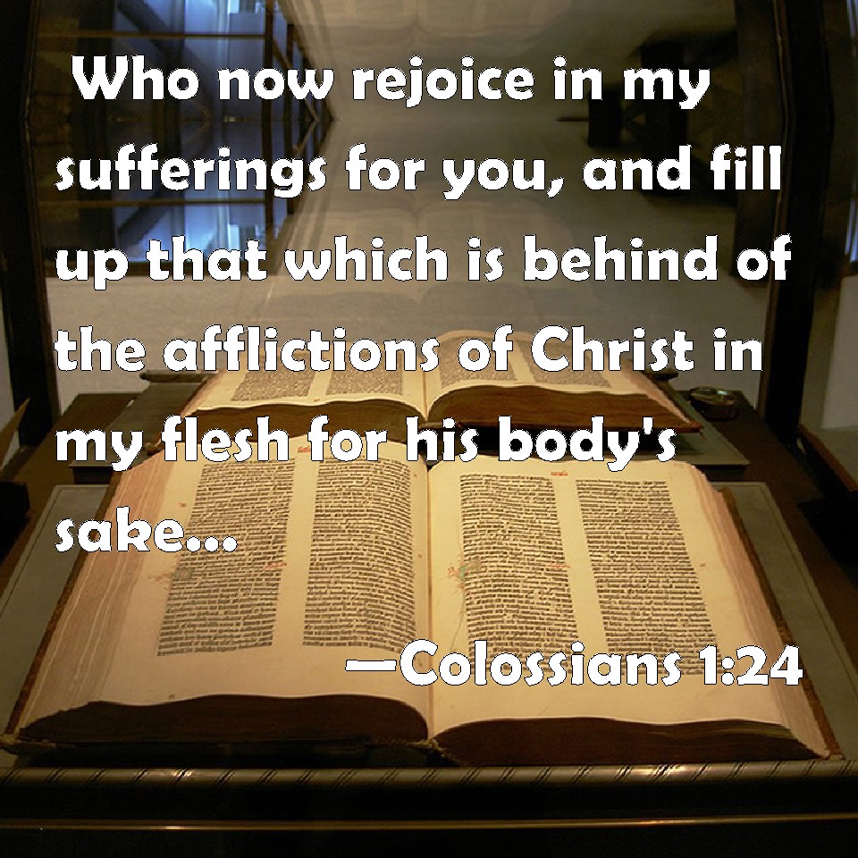 Choose a Background Colossians 1:24 Who now rejoice in my sufferings for you, and fill up that which is behind of the afflictions of Christ in my flesh for his body's sake, which is the church: KJV: Who now rejoice in my sufferings for you, and fill up that which is behind of the afflictions of Christ in my flesh for his body's sake, which is the church: DRB: Who now rejoice in my sufferings for you, and fill up those things that are wanting of the sufferings of Christ, in my flesh, for his body, which is the church: DBT: Now, I rejoice in sufferings for you, and I fill up that which is behind of the tribulations of Christ in my flesh, for his body, which is the assembly; ERV: Now I rejoice in my sufferings for your sake, and fill up on my part that which is lacking of the afflictions of Christ in my flesh for his body's sake, which is the church; WBT: Who now rejoice in my sufferings for you, and fill up that which is behind of the afflictions of Christ in my flesh for his body's sake, which is the church: WEB: Now I rejoice in my sufferings for your sake, and fill up on my part that which is lacking of the afflictions of Christ in my flesh for his body's sake, which is the assembly; YLT: I now rejoice in my sufferings for you, and do fill up the things lacking of the tribulations of the Christ in my flesh for his body, which is the assembly,Links Colossians 1:24 NIV • Colossians 1:24 NLT • Colossians 1:24 ESV • Colossians 1:24 NASB • Colossians 1:24 KJV • Colossians 1:24 Interlinear • Colossians 1:24 Commentaries • Colossians 1:24 Parallel Texts • Colossians 1:24 Bible Apps • Colossians 1:24 Parallel • Bible Hub |