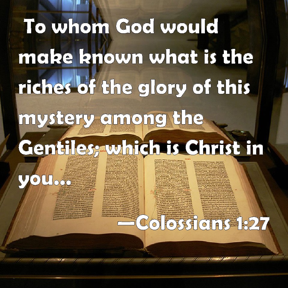 Choose a Background Colossians 1:27 To whom God would make known what is the riches of the glory of this mystery among the Gentiles; which is Christ in you, the hope of glory: KJV: To whom God would make known what is the riches of the glory of this mystery among the Gentiles; which is Christ in you, the hope of glory: DRB: To whom God would make known the riches of the glory of this mystery among the Gentiles, which is Christ, in you the hope of glory. DBT: to whom God would make known what are the riches of the glory of this mystery among the nations, which is Christ in you the hope of glory: ERV: to whom God was pleased to make known what is the riches of the glory of this mystery among the Gentiles, which is Christ in you, the hope of glory: WBT: To whom God would make known what is the riches of the glory of this mystery among the Gentiles; which is Christ in you, the hope of glory: WEB: to whom God was pleased to make known what are the riches of the glory of this mystery among the Gentiles, which is Christ in you, the hope of glory; YLT: to whom God did will to make known what is the riches of the glory of this secret among the nations — which is Christ in you, the hope of the glory,Links Colossians 1:27 NIV • Colossians 1:27 NLT • Colossians 1:27 ESV • Colossians 1:27 NASB • Colossians 1:27 KJV • Colossians 1:27 Interlinear • Colossians 1:27 Commentaries • Colossians 1:27 Parallel Texts • Colossians 1:27 Bible Apps • Colossians 1:27 Parallel • Bible Hub |