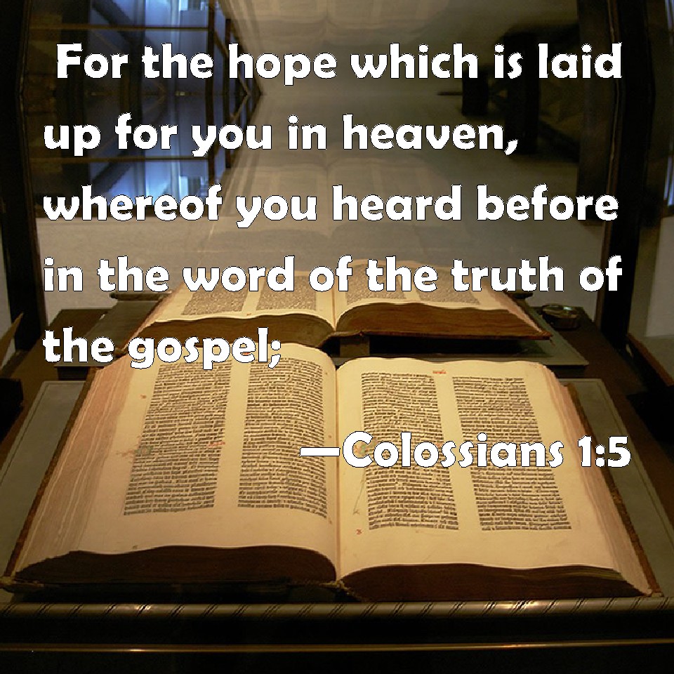Choose a Background Colossians 1:5 For the hope which is laid up for you in heaven, whereof you heard before in the word of the truth of the gospel; KJV: For the hope which is laid up for you in heaven, whereof ye heard before in the word of the truth of the gospel; DRB: For the hope that is laid up for you in heaven, which you have heard in the word of the truth of the gospel, DBT: on account of the hope which is laid up for you in the heavens; of which ye heard before in the word of the truth of the glad tidings, ERV: because of the hope which is laid up for you in the heavens, whereof ye heard before in the word of the truth of the gospel, WBT: For the hope which is laid up for you in heaven, of which ye have heard before in the word of the truth of the gospel; WEB: because of the hope which is laid up for you in the heavens, of which you heard before in the word of the truth of the Good News, YLT: because of the hope that is laid up for you in the heavens, which ye heard of before in the word of the truth of the good news,Links Colossians 1:5 NIV • Colossians 1:5 NLT • Colossians 1:5 ESV • Colossians 1:5 NASB • Colossians 1:5 KJV • Colossians 1:5 Interlinear • Colossians 1:5 Commentaries • Colossians 1:5 Parallel Texts • Colossians 1:5 Bible Apps • Colossians 1:5 Parallel • Bible Hub |