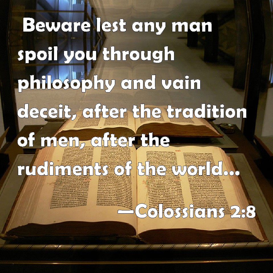Choose a Background Colossians 2:8 Beware lest any man spoil you through philosophy and vain deceit, after the tradition of men, after the rudiments of the world, and not after Christ. KJV: Beware lest any man spoil you through philosophy and vain deceit, after the tradition of men, after the rudiments of the world, and not after Christ. DRB: Beware lest any man cheat you by philosophy, and vain deceit; according to the tradition of men, according to the elements of the world, and not according to Christ: DBT: See that there be no one who shall lead you away as a prey through philosophy and vain deceit, according to the teaching of men, according to the elements of the world, and not according to Christ. ERV: Take heed lest there shall be any one that maketh spoil of you through his philosophy and vain deceit, after the tradition of men, after the rudiments of the world, and not after Christ: WBT: Beware lest any man make a prey of you through philosophy and vain deceit, after the tradition of men, after the rudiments of the world, and not after Christ. WEB: Be careful that you don't let anyone rob you through his philosophy and vain deceit, after the tradition of men, after the elements of the world, and not after Christ. YLT: See that no one shall be carrying you away as spoil through the philosophy and vain deceit, according to the deliverance of men, according to the rudiments of the world, and not according to Christ,Links Colossians 2:8 NIV • Colossians 2:8 NLT • Colossians 2:8 ESV • Colossians 2:8 NASB • Colossians 2:8 KJV • Colossians 2:8 Interlinear • Colossians 2:8 Commentaries • Colossians 2:8 Parallel Texts • Colossians 2:8 Bible Apps • Colossians 2:8 Parallel • Bible Hub |