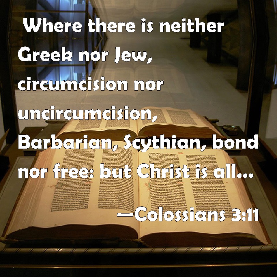 Choose a Background Colossians 3:11 Where there is neither Greek nor Jew, circumcision nor uncircumcision, Barbarian, Scythian, bond nor free: but Christ is all, and in all. KJV: Where there is neither Greek nor Jew, circumcision nor uncircumcision, Barbarian, Scythian, bond nor free: but Christ is all, and in all. DRB: Where there is neither Gentile nor Jew, circumcision nor uncircumcision, Barbarian nor Scythian, bond nor free. But Christ is all, and in all. DBT: wherein there is not Greek and Jew, circumcision and uncircumcision, barbarian, Scythian, bondman, freeman; but Christ is everything, and in all. ERV: where there cannot be Greek and Jew, circumcision and uncircumcision, barbarian, Scythian, bondman, freeman: but Christ is all, and in all. WBT: Where there is neither Greek nor Jew, circumcision nor uncircumcision, Barbarian, Scythian, bond nor free: but Christ is all, and in all. WEB: where there can't be Greek and Jew, circumcision and uncircumcision, barbarian, Scythian, bondservant, freeman; but Christ is all, and in all. YLT: where there is not Greek and Jew, circumcision and uncircumcision, foreigner, Scythian, servant, freeman — but the all and in all — Christ.Links Colossians 3:11 NIV • Colossians 3:11 NLT • Colossians 3:11 ESV • Colossians 3:11 NASB • Colossians 3:11 KJV • Colossians 3:11 Interlinear • Colossians 3:11 Commentaries • Colossians 3:11 Parallel Texts • Colossians 3:11 Bible Apps • Colossians 3:11 Parallel • Bible Hub |