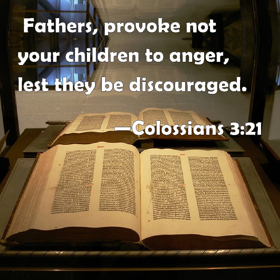 Choose a Background Colossians 3:21 Fathers, provoke not your children to anger, lest they be discouraged. KJV: Fathers, provoke not your children to anger, lest they be discouraged. DRB: Fathers, provoke not your children to indignation, lest they be discouraged. DBT: Fathers, do not vex your children, to the end that they be not disheartened. ERV: Fathers, provoke not your children, that they be not discouraged. WBT: Fathers, provoke not your children to anger, lest they be discouraged. WEB: Fathers, don't provoke your children, so that they won't be discouraged. YLT: the fathers! vex not your children, lest they be discouraged.Links Colossians 3:21 NIV • Colossians 3:21 NLT • Colossians 3:21 ESV • Colossians 3:21 NASB • Colossians 3:21 KJV • Colossians 3:21 Interlinear • Colossians 3:21 Commentaries • Colossians 3:21 Parallel Texts • Colossians 3:21 Bible Apps • Colossians 3:21 Parallel • Bible Hub |