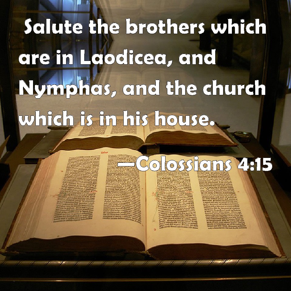 Choose a Background Colossians 4:15 Salute the brothers which are in Laodicea, and Nymphas, and the church which is in his house. KJV: Salute the brethren which are in Laodicea, and Nymphas, and the church which is in his house. DRB: Salute the brethren who are at Laodicea, and Nymphas, and the church that is in his house. DBT: Salute the brethren in Laodicea, and Nymphas, and the assembly which is in his house. ERV: Salute the brethren that are in Laodicea, and Nymphas, and the church that is in their house. WBT: Salute the brethren who are in Laodicea, and Nymphas, and the church which is in his house. WEB: Greet the brothers who are in Laodicea, and Nymphas, and the assembly that is in his house. YLT: salute ye those in Laodicea — brethren, and Nymphas, and the assembly in his house;Links Colossians 4:15 NIV • Colossians 4:15 NLT • Colossians 4:15 ESV • Colossians 4:15 NASB • Colossians 4:15 KJV • Colossians 4:15 Interlinear • Colossians 4:15 Commentaries • Colossians 4:15 Parallel Texts • Colossians 4:15 Bible Apps • Colossians 4:15 Parallel • Bible Hub |