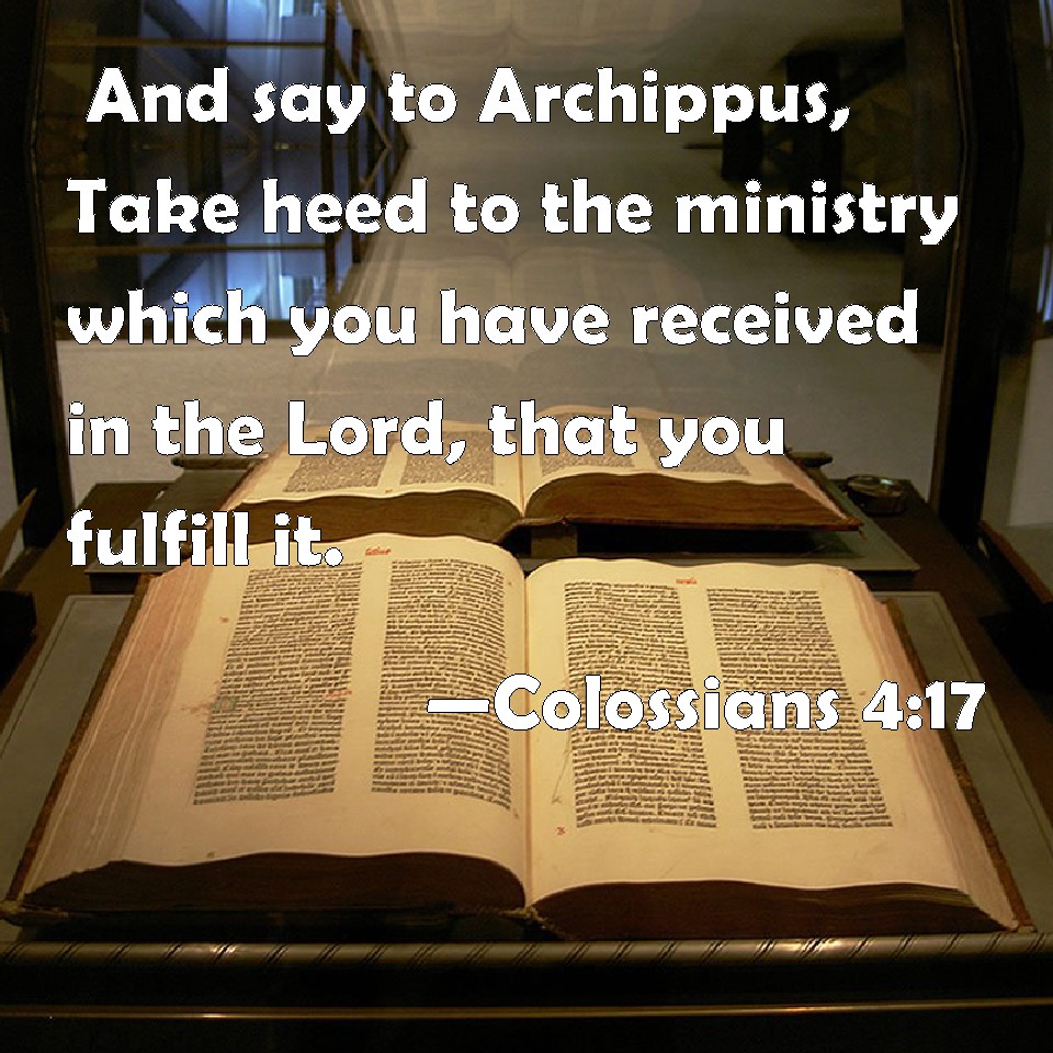 Choose a Background Colossians 4:17 And say to Archippus, Take heed to the ministry which you have received in the Lord, that you fulfill it. KJV: And say to Archippus, Take heed to the ministry which thou hast received in the Lord, that thou fulfil it. DRB: And say to Archippus: Take heed to the ministry which thou hast received in the Lord, that thou fulfil it. DBT: And say to Archippus, Take heed to the ministry which thou hast received in the Lord, to the end that thou fulfil it. ERV: And say to Archippus, Take heed to the ministry which thou hast received in the Lord, that thou fulfill it. WBT: And say to Archippus, take heed to the ministry which thou hast received in the Lord, that thou fulfill it. WEB: Tell Archippus, "Take heed to the ministry which you have received in the Lord, that you fulfill it." YLT: and say to Archippus, 'See to the ministration that thou didst receive in the Lord, that thou mayest fulfil it.'Links Colossians 4:17 NIV • Colossians 4:17 NLT • Colossians 4:17 ESV • Colossians 4:17 NASB • Colossians 4:17 KJV • Colossians 4:17 Interlinear • Colossians 4:17 Commentaries • Colossians 4:17 Parallel Texts • Colossians 4:17 Bible Apps • Colossians 4:17 Parallel • Bible Hub |