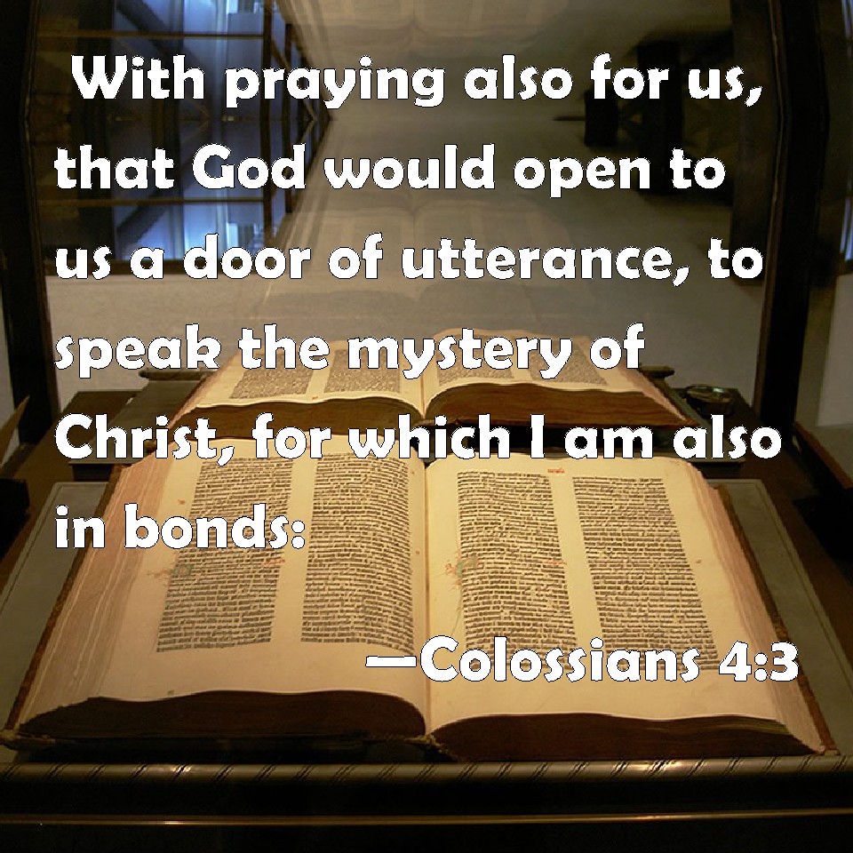 Choose a Background Colossians 4:3 With praying also for us, that God would open to us a door of utterance, to speak the mystery of Christ, for which I am also in bonds: KJV: Withal praying also for us, that God would open unto us a door of utterance, to speak the mystery of Christ, for which I am also in bonds: DRB: Praying withal for us also, that God may open unto us a door of speech to speak the mystery of Christ (for which also I am bound;) DBT: praying at the same time for us also, that God may open to us a door of the word to speak the mystery of Christ, on account of which also I am bound, ERV: withal praying for us also, that God may open unto us a door for the word, to speak the mystery of Christ, for which I am also in bonds; WBT: At the same time praying also for us, that God would open to us a door of utterance, to speak the mystery of Christ, for which I am also in bonds: WEB: praying together for us also, that God may open to us a door for the word, to speak the mystery of Christ, for which I am also in bonds; YLT: praying at the same time also for us, that God may open to us a door for the word, to speak the secret of the Christ, because of which also I have been bound,Links Colossians 4:3 NIV • Colossians 4:3 NLT • Colossians 4:3 ESV • Colossians 4:3 NASB • Colossians 4:3 KJV • Colossians 4:3 Interlinear • Colossians 4:3 Commentaries • Colossians 4:3 Parallel Texts • Colossians 4:3 Bible Apps • Colossians 4:3 Parallel • Bible Hub |