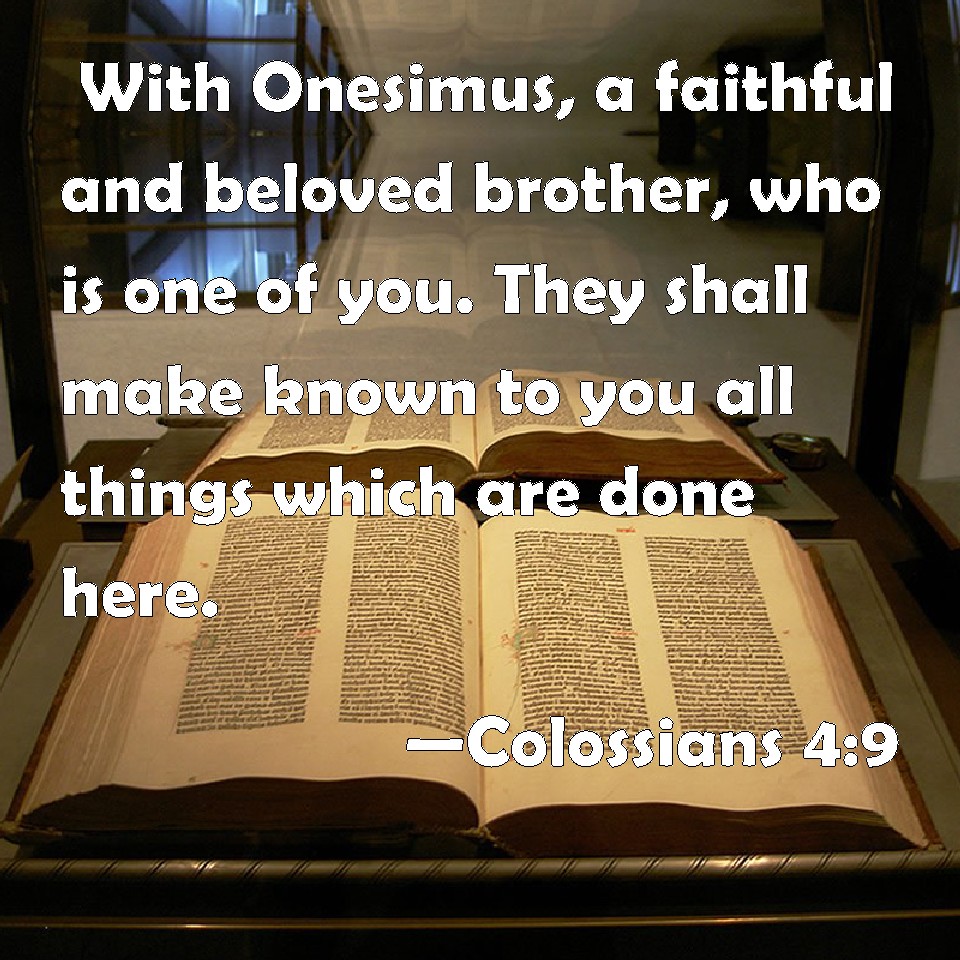 Choose a Background Colossians 4:9 With Onesimus, a faithful and beloved brother, who is one of you. They shall make known to you all things which are done here. KJV: With Onesimus, a faithful and beloved brother, who is one of you. They shall make known unto you all things which are done here. DRB: With Onesimus, a most beloved and faithful brother, who is one of you. All things that are done here, they shall make known to you. DBT: with Onesimus, the faithful and beloved brother, who is one of you. They shall make known to you everything here. ERV: together with Onesimus, the faithful and beloved brother, who is one of you. They shall make known unto you all things that are done here. WBT: With Onesimus, a faithful and beloved brother, who is one of you. They will make known to you all things which are done here. WEB: together with Onesimus, the faithful and beloved brother, who is one of you. They will make known to you everything that is going on here. YLT: with Onesimus the faithful and beloved brother, who is of you; all things to you shall they make known that are here.Links Colossians 4:9 NIV • Colossians 4:9 NLT • Colossians 4:9 ESV • Colossians 4:9 NASB • Colossians 4:9 KJV • Colossians 4:9 Interlinear • Colossians 4:9 Commentaries • Colossians 4:9 Parallel Texts • Colossians 4:9 Bible Apps • Colossians 4:9 Parallel • Bible Hub |