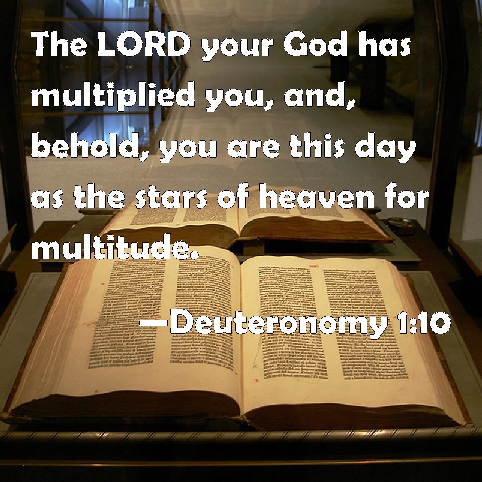 Choose a Background Deuteronomy 1:10 The LORD your God has multiplied you, and, behold, you are this day as the stars of heaven for multitude. KJV: The LORD your God hath multiplied you, and, behold, ye are this day as the stars of heaven for multitude. DRB: I alone am not able to bear you: for the Lord your God hath multiplied you, and you are this day as the stars of heaven, for multitude. DBT: Jehovah your God hath multiplied you, and behold, ye are this day as the stars of heaven for multitude. ERV: The LORD your God hath multiplied you, and, behold, ye are this day as the stars of heaven for multitude. WBT: The LORD your God hath multiplied you, and behold, ye are this day as the stars of heaven for multitude. WEB: Yahweh your God has multiplied you, and behold, you are this day as the stars of the sky for multitude. YLT: Jehovah your God hath multiplied you, and lo, ye are to-day as the stars of the heavens for multitude;Links Deuteronomy 1:10 NIV • Deuteronomy 1:10 NLT • Deuteronomy 1:10 ESV • Deuteronomy 1:10 NASB • Deuteronomy 1:10 KJV • Deuteronomy 1:10 Interlinear • Deuteronomy 1:10 Commentaries • Deuteronomy 1:10 Parallel Texts • Deuteronomy 1:10 Bible Apps • Deuteronomy 1:10 Parallel • Bible Hub |