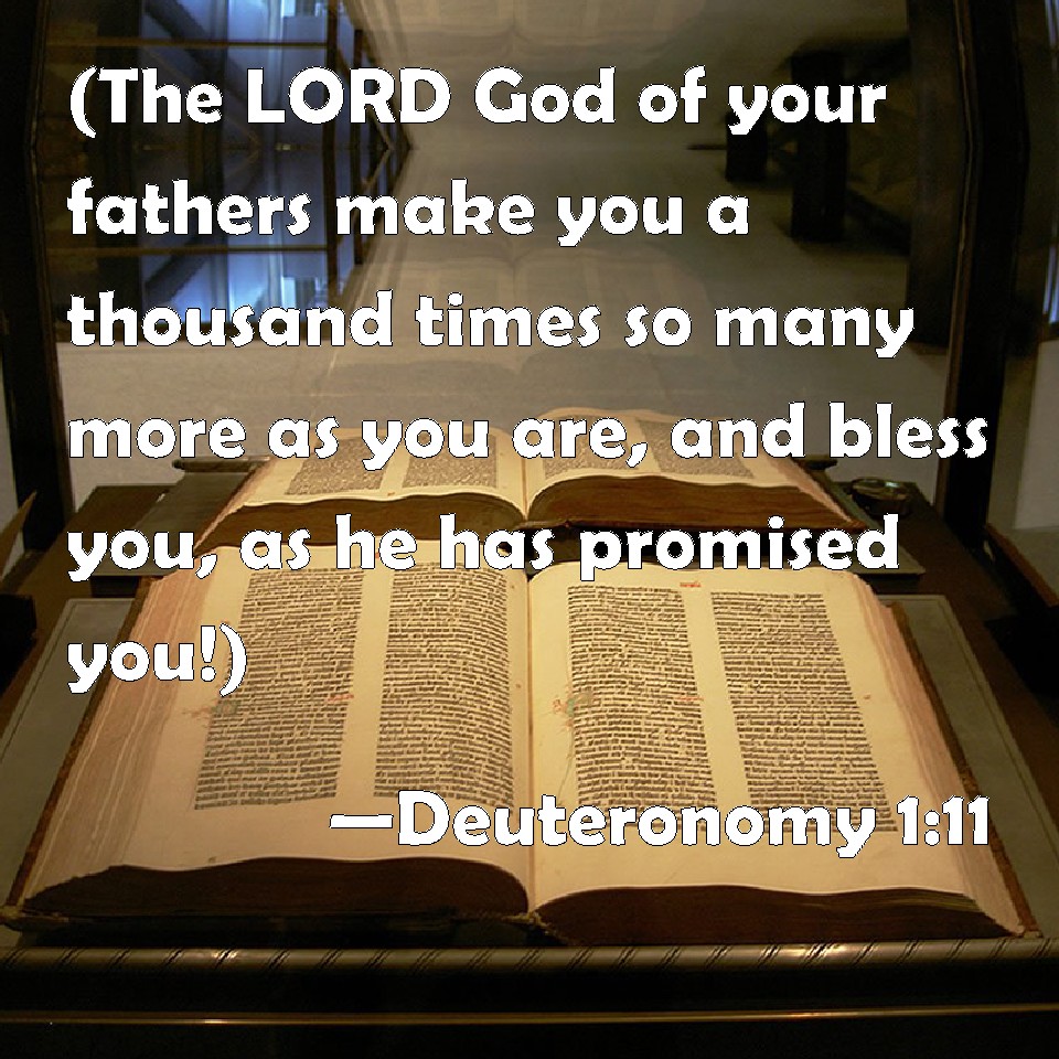 Choose a Background Deuteronomy 1:11 (The LORD God of your fathers make you a thousand times so many more as you are, and bless you, as he has promised you!) KJV: (The LORD God of your fathers make you a thousand times so many more as ye are, and bless you, as he hath promised you!) DRB: (The Lord God of your fathers add to this number many thousands, and bless you as he hath spoken.) DBT: Jehovah, the God of your fathers, make you a thousand times so many more as ye are, and bless you as he hath said unto you! ERV: The LORD, the God of your fathers, make you a thousand times so many more as ye are, and bless you, as he hath promised you! WBT: (The LORD God of your fathers make you a thousand times so many more as ye are, and bless you, as he hath promised you!) WEB: Yahweh, the God of your fathers, make you a thousand times as many as you are, and bless you, as he has promised you! YLT: Jehovah, God of your fathers, is adding to you, as ye are, a thousand times, and doth bless you as He hath spoken to you.Links Deuteronomy 1:11 NIV • Deuteronomy 1:11 NLT • Deuteronomy 1:11 ESV • Deuteronomy 1:11 NASB • Deuteronomy 1:11 KJV • Deuteronomy 1:11 Interlinear • Deuteronomy 1:11 Commentaries • Deuteronomy 1:11 Parallel Texts • Deuteronomy 1:11 Bible Apps • Deuteronomy 1:11 Parallel • Bible Hub |