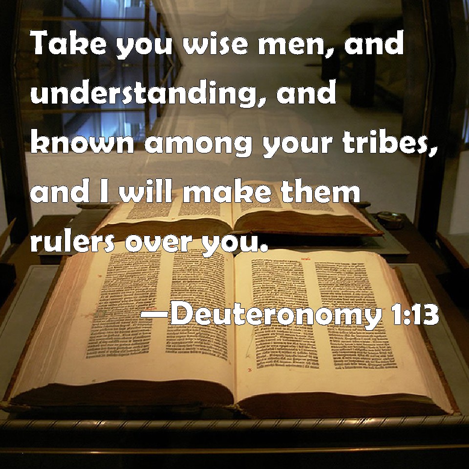 Choose a Background Deuteronomy 1:13 Take you wise men, and understanding, and known among your tribes, and I will make them rulers over you. KJV: Take you wise men, and understanding, and known among your tribes, and I will make them rulers over you. DRB: Let me have from among you wise and understanding men, and such whose conversation is approved among your tribes, that I may appoint them your rulers. DBT: Provide you wise and understanding and known men, according to your tribes, that I may make them your chiefs. ERV: Take you wise men, and understanding, and known, according to your tribes, and I will make them heads over you. WBT: Take ye wise men, and understanding, and known among your tribes, and I will make them rulers over you. WEB: Take wise men of understanding and well known according to your tribes, and I will make them heads over you." YLT: Give for yourselves men, wise and intelligent, and known to your tribes, and I set them for your heads;Links Deuteronomy 1:13 NIV • Deuteronomy 1:13 NLT • Deuteronomy 1:13 ESV • Deuteronomy 1:13 NASB • Deuteronomy 1:13 KJV • Deuteronomy 1:13 Interlinear • Deuteronomy 1:13 Commentaries • Deuteronomy 1:13 Parallel Texts • Deuteronomy 1:13 Bible Apps • Deuteronomy 1:13 Parallel • Bible Hub |