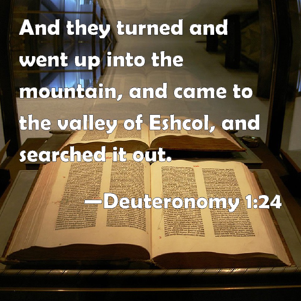 Choose a Background Deuteronomy 1:24 And they turned and went up into the mountain, and came to the valley of Eshcol, and searched it out. KJV: And they turned and went up into the mountain, and came unto the valley of Eshcol, and searched it out. DRB: Who, when they had set forward and had gone up to the mountains, came as far as the valley of the cluster: and having viewed the land, DBT: And they turned and went up into the mountain, and came to the valley of Eshcol, and searched it out. ERV: and they turned and went up into the mountain, and came unto the valley of Eshcol, and spied it out. WBT: And they turned and ascended the mountain, and came to the valley of Eshcol, and explored it. WEB: and they turned and went up into the hill country, and came to the valley of Eshcol, and spied it out. YLT: 'And they turn and go up to the hill-country, and come in unto the valley of Eshcol, and spy it,Links Deuteronomy 1:24 NIV • Deuteronomy 1:24 NLT • Deuteronomy 1:24 ESV • Deuteronomy 1:24 NASB • Deuteronomy 1:24 KJV • Deuteronomy 1:24 Interlinear • Deuteronomy 1:24 Commentaries • Deuteronomy 1:24 Parallel Texts • Deuteronomy 1:24 Bible Apps • Deuteronomy 1:24 Parallel • Bible Hub |