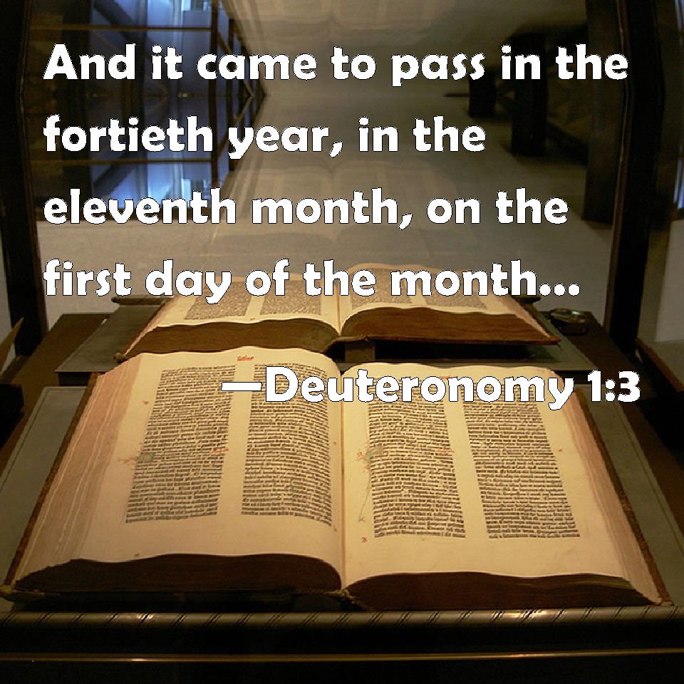 Choose a Background Deuteronomy 1:3 And it came to pass in the fortieth year, in the eleventh month, on the first day of the month, that Moses spoke to the children of Israel, according to all that the LORD had given him in commandment to them; KJV: And it came to pass in the fortieth year, in the eleventh month, on the first day of the month, that Moses spake unto the children of Israel, according unto all that the LORD had given him in commandment unto them; DRB: In the fortieth year, the eleventh month, the first day of the month, Moses spoke to the children of Israel all that the Lord had commanded him to say to them: DBT: And it came to pass in the fortieth year, in the eleventh month, on the first of the month, that Moses spoke to the children of Israel, according to all that Jehovah had given him in command to them; ERV: And it came to pass in the fortieth year, in the eleventh month, on the first day of the month, that Moses spake unto the children of Israel, according unto all that the LORD had given him in commandment unto them; WBT: And it came to pass in the fortieth year, in the eleventh month, on the first day of the month, that Moses spoke to the children of Israel, according to all that the LORD had given him in commandment to them; WEB: It happened in the fortieth year, in the eleventh month, on the first day of the month, that Moses spoke to the children of Israel, according to all that Yahweh had given him in commandment to them; YLT: And it cometh to pass in the fortieth year, in the eleventh month, on the first of the month hath Moses spoken unto the sons of Israel according to all that Jehovah hath commanded him concerning them;Links Deuteronomy 1:3 NIV • Deuteronomy 1:3 NLT • Deuteronomy 1:3 ESV • Deuteronomy 1:3 NASB • Deuteronomy 1:3 KJV • Deuteronomy 1:3 Interlinear • Deuteronomy 1:3 Commentaries • Deuteronomy 1:3 Parallel Texts • Deuteronomy 1:3 Bible Apps • Deuteronomy 1:3 Parallel • Bible Hub |