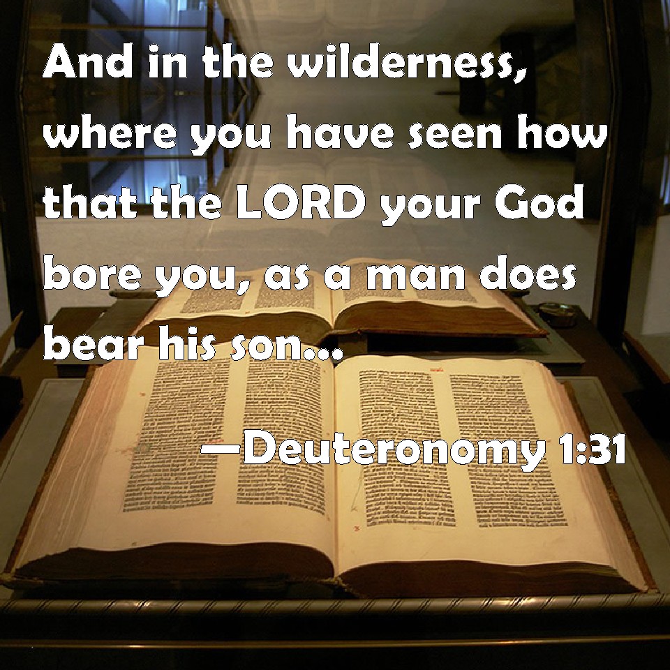 Choose a Background Deuteronomy 1:31 And in the wilderness, where you have seen how that the LORD your God bore you, as a man does bear his son, in all the way that you went, until you came into this place. KJV: And in the wilderness, where thou hast seen how that the LORD thy God bare thee, as a man doth bear his son, in all the way that ye went, until ye came into this place. DRB: And in the wilderness (as thou hast seen) the Lord thy God hath carried thee, as a man is wont to carry his little son, all the way that you have come, until you came to this place. DBT: and in the wilderness where thou hast seen that Jehovah thy God bore thee, as a man doth bear his son, in all the way that ye went, until ye came to this place. ERV: and in the wilderness, where thou hast seen how that the LORD thy God bare thee, as a man doth bear his son, in all the way that ye went, until ye came unto this place. WBT: And in the wilderness, where thou hast seen how the LORD thy God bore thee, as a man doth bear his son, in all the way that ye went, until ye came into this place. WEB: and in the wilderness, where you have seen how that Yahweh your God bore you, as a man does bear his son, in all the way that you went, until you came to this place." YLT: and in the wilderness, where thou hast seen that Jehovah thy God hath borne thee as a man beareth his son, in all the way which ye have gone, till your coming in unto this place.Links Deuteronomy 1:31 NIV • Deuteronomy 1:31 NLT • Deuteronomy 1:31 ESV • Deuteronomy 1:31 NASB • Deuteronomy 1:31 KJV • Deuteronomy 1:31 Interlinear • Deuteronomy 1:31 Commentaries • Deuteronomy 1:31 Parallel Texts • Deuteronomy 1:31 Bible Apps • Deuteronomy 1:31 Parallel • Bible Hub |
