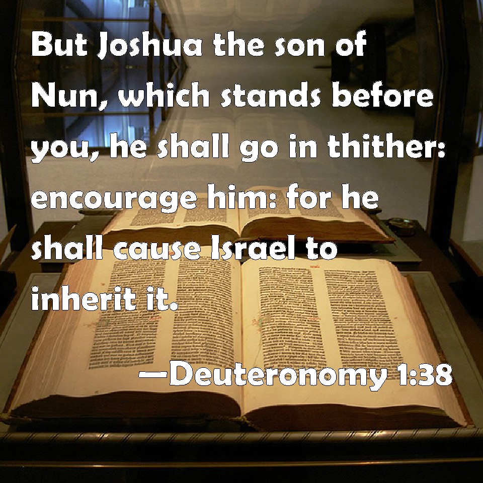 Choose a Background Deuteronomy 1:38 But Joshua the son of Nun, which stands before you, he shall go in thither: encourage him: for he shall cause Israel to inherit it. KJV: But Joshua the son of Nun, which standeth before thee, he shall go in thither: encourage him: for he shall cause Israel to inherit it. DRB: But Josue the son of Nun, thy minister, he shall go in for thee: exhort and encourage him, and he shall divide the land by lot to Israel. DBT: Joshua the son of Nun, who standeth before thee, he shall go in thither: strengthen him, for he shall cause Israel to inherit it. ERV: Joshua the son of Nun, which standeth before thee, he shall go in thither: encourage thou him; for he shall cause Israel to inherit it. WBT: But Joshua the son of Nun, who standeth before thee, he shall go in thither. Encourage him: for he shall cause Israel to inherit it. WEB: Joshua the son of Nun, who stands before you, he shall go in there: encourage you him; for he shall cause Israel to inherit it. YLT: Joshua son of Nun, who is standing before thee, he goeth in thither; him strengthen thou; for he doth cause Israel to inherit.Links Deuteronomy 1:38 NIV • Deuteronomy 1:38 NLT • Deuteronomy 1:38 ESV • Deuteronomy 1:38 NASB • Deuteronomy 1:38 KJV • Deuteronomy 1:38 Interlinear • Deuteronomy 1:38 Commentaries • Deuteronomy 1:38 Parallel Texts • Deuteronomy 1:38 Bible Apps • Deuteronomy 1:38 Parallel • Bible Hub |