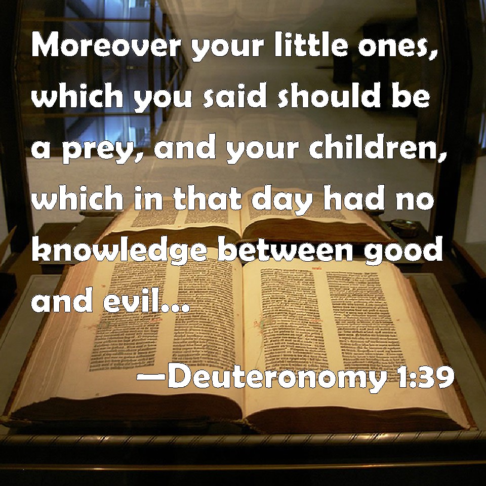 Choose a Background Deuteronomy 1:39 Moreover your little ones, which you said should be a prey, and your children, which in that day had no knowledge between good and evil, they shall go in thither, and to them will I give it, and they shall possess it. KJV: Moreover your little ones, which ye said should be a prey, and your children, which in that day had no knowledge between good and evil, they shall go in thither, and unto them will I give it, and they shall possess it. DRB: Your children, of whom you said that they should be led away captives, and your sons who know not this day the difference of good and evil, they shall go in: and to them I will give the land, and they shall possess it. DBT: And your little ones, of whom ye said, They shall be a prey, and your children, who this day know neither good nor evil, they shall go in thither, and unto them will I give it, and they shall possess it. ERV: Moreover your little ones, which ye said should be a prey, and your children, which this day have no knowledge of good or evil, they shall go in thither, and unto them will I give it, and they shall possess it. WBT: Moreover, your little ones, which ye said should be a prey, and your children, which in that day had no knowledge between good and evil, they shall go in thither, and to them will I give it, and they shall possess it. WEB: Moreover your little ones, whom you said should be a prey, and your children, who this day have no knowledge of good or evil, they shall go in there, and to them will I give it, and they shall possess it. YLT: 'And your infants, of whom ye have said, For a prey they are, and your sons who have not known to-day good and evil, they go in thither, and to them I give it, and they possess it;Links Deuteronomy 1:39 NIV • Deuteronomy 1:39 NLT • Deuteronomy 1:39 ESV • Deuteronomy 1:39 NASB • Deuteronomy 1:39 KJV • Deuteronomy 1:39 Interlinear • Deuteronomy 1:39 Commentaries • Deuteronomy 1:39 Parallel Texts • Deuteronomy 1:39 Bible Apps • Deuteronomy 1:39 Parallel • Bible Hub |