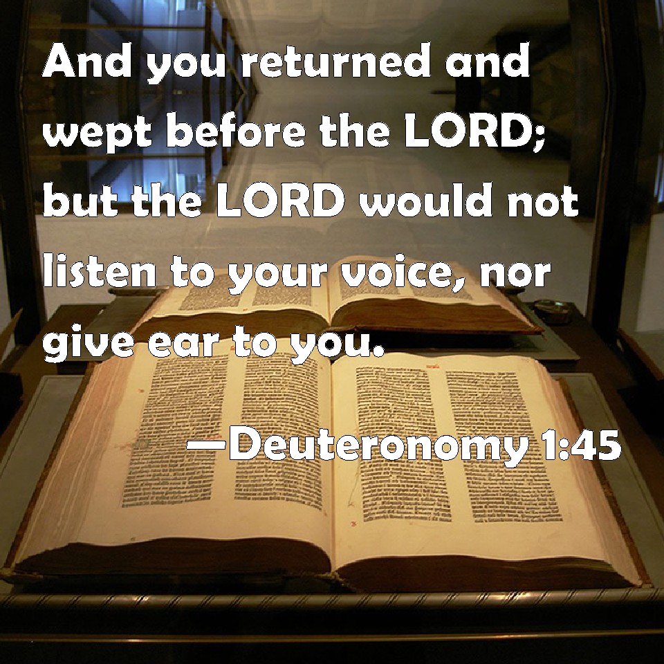 Choose a Background Deuteronomy 1:45 And you returned and wept before the LORD; but the LORD would not listen to your voice, nor give ear to you. KJV: And ye returned and wept before the LORD; but the LORD would not hearken to your voice, nor give ear unto you. DRB: And when you returned and wept before the Lord, he heard you not, neither would he yield to ;your voice. DBT: And ye returned and wept before Jehovah, but Jehovah would not listen to your voice, nor give ear unto you. ERV: And ye returned and wept before the LORD; but the LORD hearkened not to your voice, nor gave ear unto you. WBT: And ye returned and wept before the LORD; but the LORD would not hearken to your voice, nor give ear to you. WEB: You returned and wept before Yahweh; but Yahweh didn't listen to your voice, nor gave ear to you. YLT: 'And ye turn back and weep before Jehovah, and Jehovah hath not hearkened to your voice, nor hath he given ear unto you;Links Deuteronomy 1:45 NIV • Deuteronomy 1:45 NLT • Deuteronomy 1:45 ESV • Deuteronomy 1:45 NASB • Deuteronomy 1:45 KJV • Deuteronomy 1:45 Interlinear • Deuteronomy 1:45 Commentaries • Deuteronomy 1:45 Parallel Texts • Deuteronomy 1:45 Bible Apps • Deuteronomy 1:45 Parallel • Bible Hub |