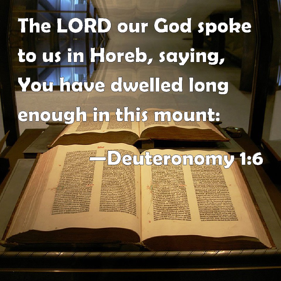 Choose a Background Deuteronomy 1:6 The LORD our God spoke to us in Horeb, saying, You have dwelled long enough in this mount: KJV: The LORD our God spake unto us in Horeb, saying, Ye have dwelt long enough in this mount: DRB: The Lord our God spoke to us in Horeb, saying: You have stayed long enough in this mountain: DBT: Jehovah our God spoke unto us in Horeb, saying, Ye have stayed long enough in this mountain. ERV: The LORD our God spake unto us in Horeb, saying, Ye have dwelt long enough in this mountain: WBT: The LORD our God spoke to us in Horeb, saying, Ye have dwelt long enough in this mount: WEB: "Yahweh our God spoke to us in Horeb, saying, You have lived long enough in this mountain: YLT: Jehovah our God hath spoken unto us in Horeb, saying, Enough to you — of dwelling in this mount;Links Deuteronomy 1:6 NIV • Deuteronomy 1:6 NLT • Deuteronomy 1:6 ESV • Deuteronomy 1:6 NASB • Deuteronomy 1:6 KJV • Deuteronomy 1:6 Interlinear • Deuteronomy 1:6 Commentaries • Deuteronomy 1:6 Parallel Texts • Deuteronomy 1:6 Bible Apps • Deuteronomy 1:6 Parallel • Bible Hub |