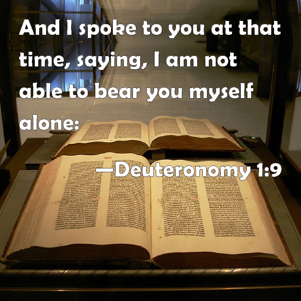 Choose a Background Deuteronomy 1:9 And I spoke to you at that time, saying, I am not able to bear you myself alone: KJV: And I spake unto you at that time, saying, I am not able to bear you myself alone: DRB: And I said to you at that time: DBT: And I spoke unto you at that time, saying, I am not able to bear you myself alone. ERV: And I spake unto you at that time, saying, I am not able to bear you myself alone: WBT: And I spoke to you at that time, saying, I am not able to bear you myself alone: WEB: I spoke to you at that time, saying, "I am not able to bear you myself alone: YLT: 'And I speak unto you at that time, saying, I am not able by myself to bear you;Links Deuteronomy 1:9 NIV • Deuteronomy 1:9 NLT • Deuteronomy 1:9 ESV • Deuteronomy 1:9 NASB • Deuteronomy 1:9 KJV • Deuteronomy 1:9 Interlinear • Deuteronomy 1:9 Commentaries • Deuteronomy 1:9 Parallel Texts • Deuteronomy 1:9 Bible Apps • Deuteronomy 1:9 Parallel • Bible Hub |