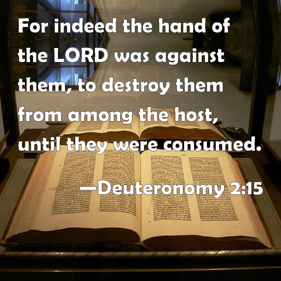 Choose a Background Deuteronomy 2:15 For indeed the hand of the LORD was against them, to destroy them from among the host, until they were consumed. KJV: For indeed the hand of the LORD was against them, to destroy them from among the host, until they were consumed. DRB: For his hand was against them, that they should perish from the midst of the camp. DBT: Moreover the hand of Jehovah was against them to destroy them from the midst of the camp, until they were consumed. ERV: Moreover the hand of the LORD was against them, to destroy them from the midst of the camp, until they were consumed. WBT: For indeed the hand of the LORD was against them, to destroy them from among the host, until they were consumed. WEB: Moreover the hand of Yahweh was against them, to destroy them from the midst of the camp, until they were consumed. YLT: and also the hand of Jehovah hath been against them, to destroy them from the midst of the camp, till they are consumed.Links Deuteronomy 2:15 NIV • Deuteronomy 2:15 NLT • Deuteronomy 2:15 ESV • Deuteronomy 2:15 NASB • Deuteronomy 2:15 KJV • Deuteronomy 2:15 Interlinear • Deuteronomy 2:15 Commentaries • Deuteronomy 2:15 Parallel Texts • Deuteronomy 2:15 Bible Apps • Deuteronomy 2:15 Parallel • Bible Hub |