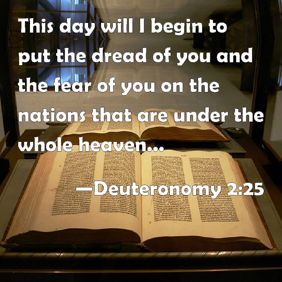 Choose a Background Deuteronomy 2:25 This day will I begin to put the dread of you and the fear of you on the nations that are under the whole heaven, who shall hear report of you, and shall tremble, and be in anguish because of you. KJV: This day will I begin to put the dread of thee and the fear of thee upon the nations that are under the whole heaven, who shall hear report of thee, and shall tremble, and be in anguish because of thee. DRB: This day will I begin to send the dread and fear of thee upon the nations that dwell under the whole heaven: that when they hear thy name they may fear and tremble, and be in pain like women in travail. DBT: This day will I begin to put the dread of thee and the fear of thee upon the peoples under the whole heaven; who will hear report of thee, and will tremble, and quake because of thee. ERV: This day will I begin to put the dread of thee and the fear of thee upon the peoples that are under the whole heaven, who shall hear the report of thee, and shall tremble, and be in anguish because of thee. WBT: This day will I begin to put the dread of thee and the fear of thee upon the nations that are under the whole heaven, who shall hear report of thee, and shall tremble, and be in anguish because of thee. WEB: This day will I begin to put the dread of you and the fear of you on the peoples who are under the whole sky, who shall hear the report of you, and shall tremble, and be in anguish because of you." YLT: This day I begin to put thy dread and thy fear on the face of the peoples under the whole heavens, who hear thy fame, and have trembled and been pained because of thee.Links Deuteronomy 2:25 NIV • Deuteronomy 2:25 NLT • Deuteronomy 2:25 ESV • Deuteronomy 2:25 NASB • Deuteronomy 2:25 KJV • Deuteronomy 2:25 Interlinear • Deuteronomy 2:25 Commentaries • Deuteronomy 2:25 Parallel Texts • Deuteronomy 2:25 Bible Apps • Deuteronomy 2:25 Parallel • Bible Hub |