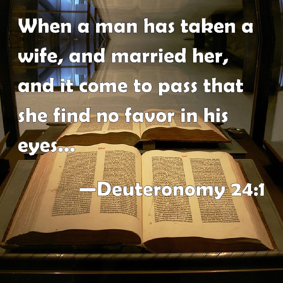 Choose a Background Deuteronomy 24:1 When a man has taken a wife, and married her, and it come to pass that she find no favor in his eyes, because he has found some uncleanness in her: then let him write her a bill of divorce, and give it in her hand, and send her out of his house. KJV: When a man hath taken a wife, and married her, and it come to pass that she find no favour in his eyes, because he hath found some uncleanness in her: then let him write her a bill of divorcement, and give it in her hand, and send her out of his house. DRB: If a man take a wife, and have her, and she find not favour in his eyes, for some uncleanness: he shall write a bill of divorce, and shall give it in her hand, and send her out of his house. DBT: When a man taketh a wife, and marrieth her, it shall be if she find no favour in his eyes, because he hath found some unseemly thing in her, that he shall write her a letter of divorce, and give it into her hand, and send her out of his house. ERV: When a man taketh a wife, and marrieth her, then it shall be, if she find no favour in his eyes, because he hath found some unseemly thing in her, that he shall write her a bill of divorcement, and give it in her hand, and send her out of his house. WBT: When a man hath taken a wife, and married her, and it shall come to pass that she findeth no favor in his eyes, because he hath found some uncleanness in her: then let him write her a bill of divorcement, and give it in her hand, and send her out of his house. WEB: When a man takes a wife, and marries her, then it shall be, if she find no favor in his eyes, because he has found some unseemly thing in her, that he shall write her a bill of divorce, and give it in her hand, and send her out of his house. YLT: When a man doth take a wife, and hath married her, and it hath been, if she doth not find grace in his eyes (for he hath found in her nakedness of anything), and he hath written for her a writing of divorce, and given it into her hand, and sent her out of his house,Links Deuteronomy 24:1 NIV • Deuteronomy 24:1 NLT • Deuteronomy 24:1 ESV • Deuteronomy 24:1 NASB • Deuteronomy 24:1 KJV • Deuteronomy 24:1 Interlinear • Deuteronomy 24:1 Commentaries • Deuteronomy 24:1 Parallel Texts • Deuteronomy 24:1 Bible Apps • Deuteronomy 24:1 Parallel • Bible Hub |