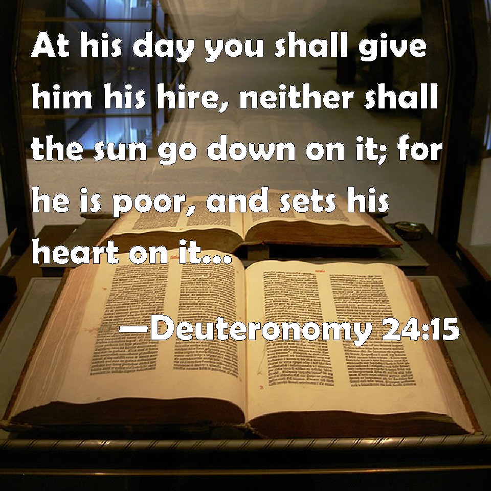 Choose a Background Deuteronomy 24:15 At his day you shall give him his hire, neither shall the sun go down on it; for he is poor, and sets his heart on it: lest he cry against you to the LORD, and it be sin to you. KJV: At his day thou shalt give him his hire, neither shall the sun go down upon it; for he is poor, and setteth his heart upon it: lest he cry against thee unto the LORD, and it be sin unto thee. DRB: But thou shalt pay him the price of his labour the same day, before the going down of the sun, because he is poor, and with it maintaineth his life: lest he cry against thee to the Lord, and it be reputed to thee for a sin. DBT: on his day thou shalt give him his hire, neither shall the sun go down upon it; for he is poor, and his soul yearneth after it; lest he cry against thee to Jehovah, and it be a sin in thee. ERV: in his day thou shalt give him his hire, neither shall the sun go down upon it; for he is poor, and setteth his heart upon it: lest he cry against thee unto the LORD, and it be sin unto thee. WBT: At his day thou shalt give him his hire, neither shall the sun go down upon it, for he is poor, and setteth his heart upon it: lest he should cry against thee to the LORD, and it be sin to thee. WEB: in his day you shall give him his hire, neither shall the sun go down on it; for he is poor, and sets his heart on it: lest he cry against you to Yahweh, and it be sin to you. YLT: in his day thou dost give his hire, and the sun doth not go in upon it, for he is poor, and unto it he is lifting up his soul, and he doth not cry against thee unto Jehovah, and it hath been in thee — sin.Links Deuteronomy 24:15 NIV • Deuteronomy 24:15 NLT • Deuteronomy 24:15 ESV • Deuteronomy 24:15 NASB • Deuteronomy 24:15 KJV • Deuteronomy 24:15 Interlinear • Deuteronomy 24:15 Commentaries • Deuteronomy 24:15 Parallel Texts • Deuteronomy 24:15 Bible Apps • Deuteronomy 24:15 Parallel • Bible Hub |