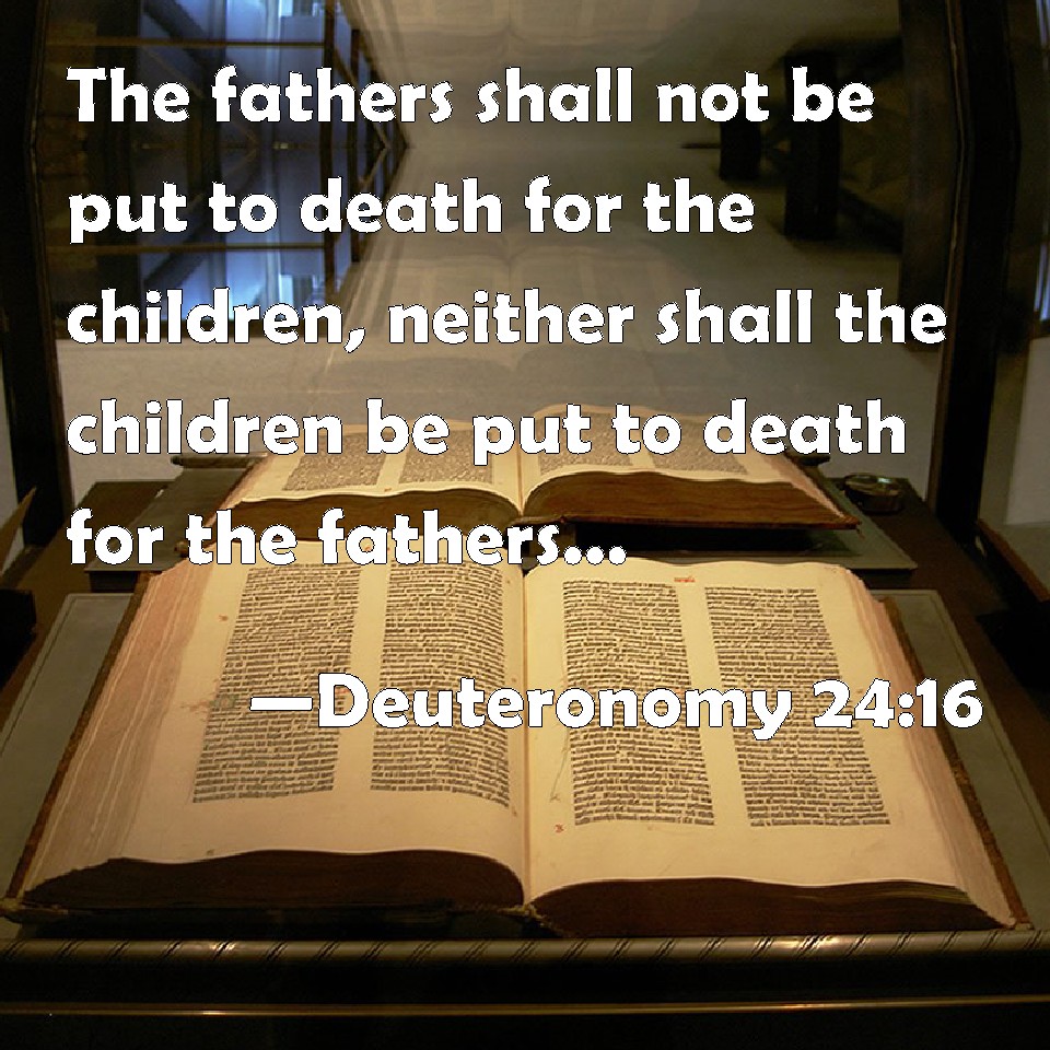 Choose a Background Deuteronomy 24:16 The fathers shall not be put to death for the children, neither shall the children be put to death for the fathers: every man shall be put to death for his own sin. KJV: The fathers shall not be put to death for the children, neither shall the children be put to death for the fathers: every man shall be put to death for his own sin. DRB: The fathers shall not be put to death for the children, nor the children for the fathers, but every one shall die for his own sin. DBT: The fathers shall not be put to death for the sons, neither shall the sons be put to death for the fathers: every man shall be put to death for his own sin. ERV: The fathers shall not be put to death for the children, neither shall the children be put to death for the fathers: every man shall be put to death for his own sin. WBT: The fathers shall not be put to death for the children, neither shall the children be put to death for the fathers: every man shall be put to death for his own sin. WEB: The fathers shall not be put to death for the children, neither shall the children be put to death for the fathers: every man shall be put to death for his own sin. YLT: Fathers are not put to death for sons, and sons are not put to death for fathers — each for his own sin, they are put to death.Links Deuteronomy 24:16 NIV • Deuteronomy 24:16 NLT • Deuteronomy 24:16 ESV • Deuteronomy 24:16 NASB • Deuteronomy 24:16 KJV • Deuteronomy 24:16 Interlinear • Deuteronomy 24:16 Commentaries • Deuteronomy 24:16 Parallel Texts • Deuteronomy 24:16 Bible Apps • Deuteronomy 24:16 Parallel • Bible Hub |