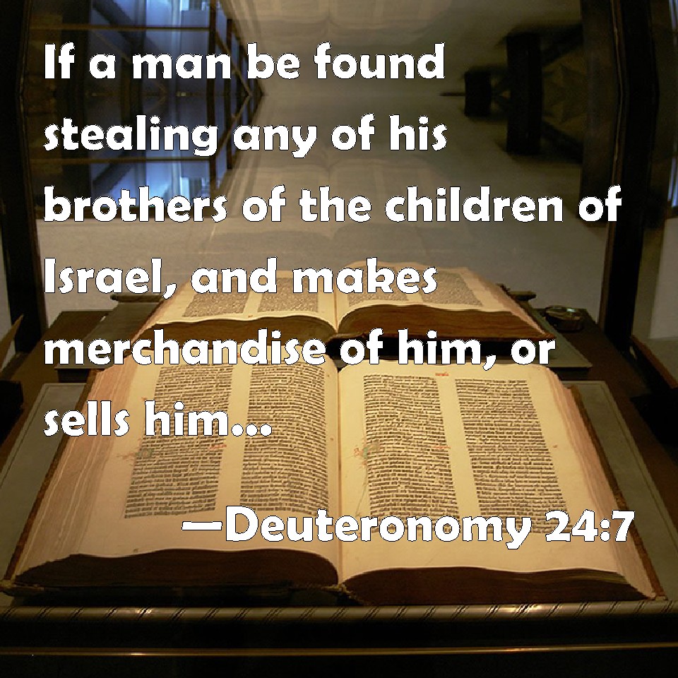 Choose a Background Deuteronomy 24:7 If a man be found stealing any of his brothers of the children of Israel, and makes merchandise of him, or sells him; then that thief shall die; and you shall put evil away from among you. KJV: If a man be found stealing any of his brethren of the children of Israel, and maketh merchandise of him, or selleth him; then that thief shall die; and thou shalt put evil away from among you. DRB: If ally man be found soliciting his brother of the children of Israel, and selling him shall take a price, he shall be put to death, and thou shalt take away the evil from the midst of thee. DBT: If a man be found who hath stolen one of his brethren of the children of Israel, and who hath treated him as a slave and sold him, that thief shall die; and thou shalt put evil away from thy midst. ERV: If a man be found stealing any of his brethren of the children of Israel, and he deal with him as a slave, or sell him; then that thief shall die: so shalt thou put away the evil from the midst of thee. WBT: If a man shall be found stealing any of his brethren of the children of Israel, and shall make merchandise of him, or sell him; then that thief shall die; and thou shalt remove evil from among you. WEB: If a man be found stealing any of his brothers of the children of Israel, and he deal with him as a slave, or sell him; then that thief shall die: so you shall put away the evil from the midst of you. YLT: 'When a man is found stealing a person, of his brethren, of the sons of Israel, and hath tyrannized over him, and sold him, then hath that thief died, and thou hast put away the evil thing out of thy midst.Links Deuteronomy 24:7 NIV • Deuteronomy 24:7 NLT • Deuteronomy 24:7 ESV • Deuteronomy 24:7 NASB • Deuteronomy 24:7 KJV • Deuteronomy 24:7 Interlinear • Deuteronomy 24:7 Commentaries • Deuteronomy 24:7 Parallel Texts • Deuteronomy 24:7 Bible Apps • Deuteronomy 24:7 Parallel • Bible Hub |