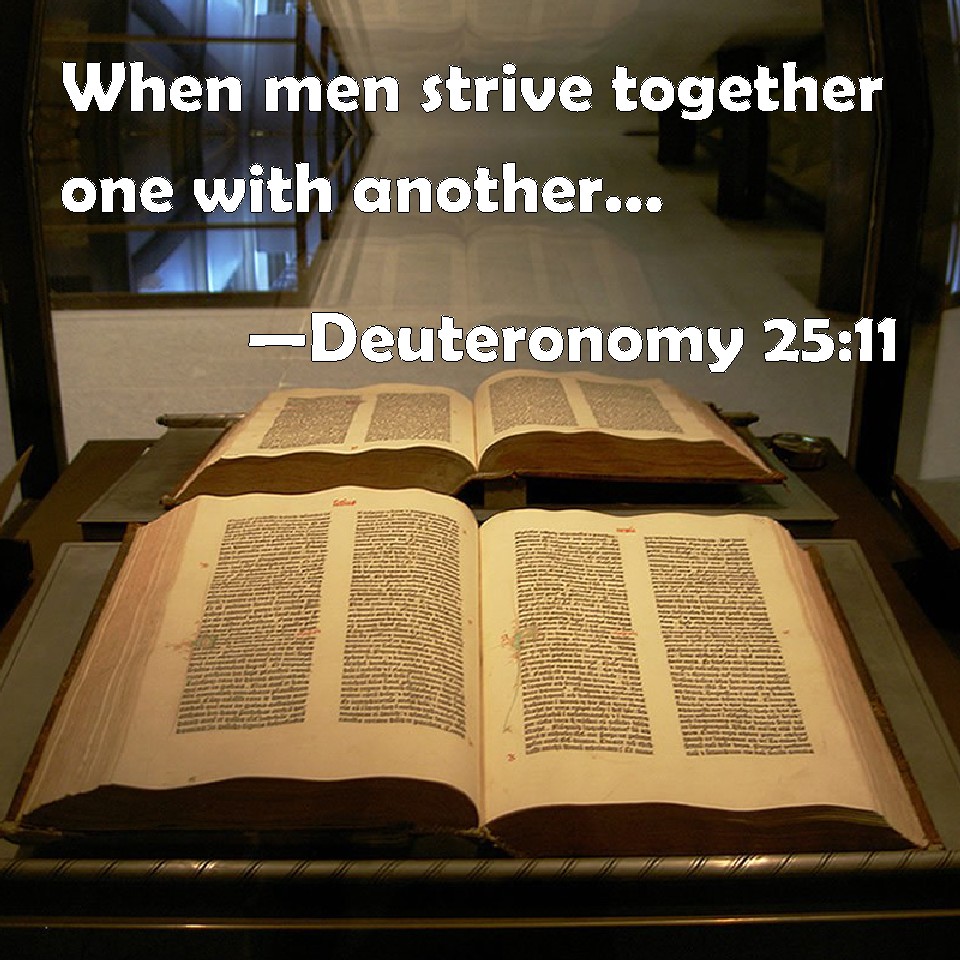 Choose a Background Deuteronomy 25:11 When men strive together one with another, and the wife of the one draws near for to deliver her husband out of the hand of him that smites him, and puts forth her hand, and takes him by the secrets: KJV: When men strive together one with another, and the wife of the one draweth near for to deliver her husband out of the hand of him that smiteth him, and putteth forth her hand, and taketh him by the secrets: DRB: If two men have words together, and one begin to fight against the other, and the other's wife willing to deliver her husband out of the hand of the stronger, shall put forth her hand, and take him by the secrets, DBT: When men fight together one with another, and the wife of the one come near to rescue her husband out of the hand of him that smiteth him, and stretch out her hand, and seize him by his secret parts, ERV: When men strive together one with another, and the wife of the one draweth near for to deliver her husband out of the hand of him that smiteth him, and putteth forth her hand, and taketh him by the secrets: WBT: When men strive together one with another, and the wife of the one draweth near to deliver her husband from the hand of him that smiteth him, and putteth forth her hand, and taketh him by the secrets: WEB: When men strive together one with another, and the wife of the one draws near to deliver her husband out of the hand of him who strikes him, and puts forth her hand, and takes him by the secrets; YLT: 'When men strive together, one with another, and the wife of the one hath drawn near to deliver her husband out of the hand of his smiter, and hath put forth her hand, and laid hold on his secrets,Links Deuteronomy 25:11 NIV • Deuteronomy 25:11 NLT • Deuteronomy 25:11 ESV • Deuteronomy 25:11 NASB • Deuteronomy 25:11 KJV • Deuteronomy 25:11 Interlinear • Deuteronomy 25:11 Commentaries • Deuteronomy 25:11 Parallel Texts • Deuteronomy 25:11 Bible Apps • Deuteronomy 25:11 Parallel • Bible Hub |