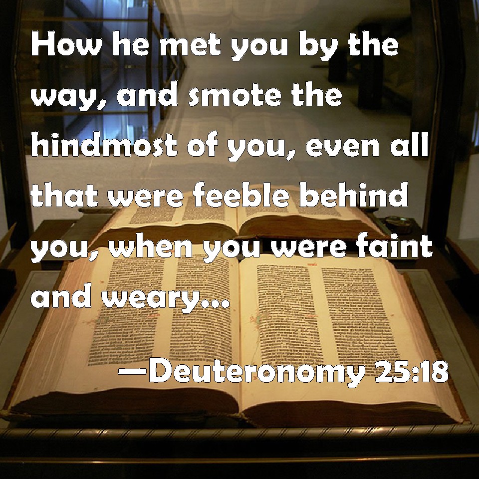 Choose a Background Deuteronomy 25:18 How he met you by the way, and smote the hindmost of you, even all that were feeble behind you, when you were faint and weary; and he feared not God. KJV: How he met thee by the way, and smote the hindmost of thee, even all that were feeble behind thee, when thou wast faint and weary; and he feared not God. DRB: How he met thee: and slew the hindmost of the army, who sat down, being weary, when thou wast spent with hunger and labour, and he feared not God. DBT: how he met thee on the way, and smote the hindmost of thee, all the feeble that lagged behind thee, when thou wast faint and weary, and he feared not God. ERV: how he met thee by the way, and smote the hindmost of thee, all that were feeble behind thee, when thou wast faint and weary; and he feared not God. WBT: How he met thee by the way, and smote the hindmost of thee, even all that were feeble behind thee, when thou wast faint and weary; and he feared not God. WEB: how he met you by the way, and struck the hindmost of you, all who were feeble behind you, when you were faint and weary; and he didn't fear God. YLT: that he hath met thee in the way, and smiteth in all those feeble behind thee (and thou wearied and fatigued), and is not fearing God.Links Deuteronomy 25:18 NIV • Deuteronomy 25:18 NLT • Deuteronomy 25:18 ESV • Deuteronomy 25:18 NASB • Deuteronomy 25:18 KJV • Deuteronomy 25:18 Interlinear • Deuteronomy 25:18 Commentaries • Deuteronomy 25:18 Parallel Texts • Deuteronomy 25:18 Bible Apps • Deuteronomy 25:18 Parallel • Bible Hub |