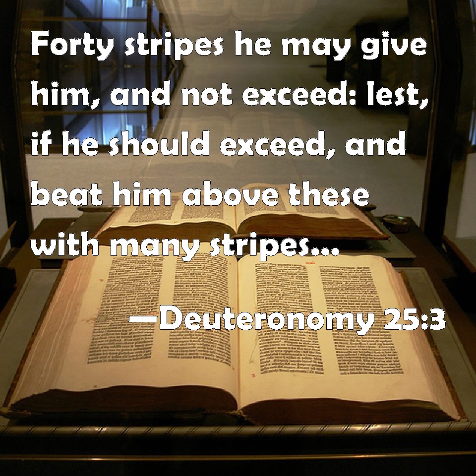Choose a Background Deuteronomy 25:3 Forty stripes he may give him, and not exceed: lest, if he should exceed, and beat him above these with many stripes, then your brother should seem vile to you. KJV: Forty stripes he may give him, and not exceed: lest, if he should exceed, and beat him above these with many stripes, then thy brother should seem vile unto thee. DRB: Yet so, that they exceed not the number of forty: lest thy brother depart shamefully torn before thy eyes. DBT: With forty stripes shall they beat him; they shall not exceed, lest, if they continue to beat him with many stripes above these, thy brother become despicable in thine eyes. ERV: Forty stripes he may give him, he shall not exceed: lest, if he should exceed, and beat him above these with many stripes, then thy brother should seem vile unto thee. WBT: Forty stripes he may give him, and not exceed: lest if he should exceed, and beat him above these with many stripes, then thy brother should seem vile to thee. WEB: Forty stripes he may give him, he shall not exceed; lest, if he should exceed, and beat him above these with many stripes, then your brother should seem vile to you. YLT: forty times he doth smite him — he is not adding, lest, he is adding to smite him above these — many stripes, and thy brother is lightly esteemed in thine eyes.Links Deuteronomy 25:3 NIV • Deuteronomy 25:3 NLT • Deuteronomy 25:3 ESV • Deuteronomy 25:3 NASB • Deuteronomy 25:3 KJV • Deuteronomy 25:3 Interlinear • Deuteronomy 25:3 Commentaries • Deuteronomy 25:3 Parallel Texts • Deuteronomy 25:3 Bible Apps • Deuteronomy 25:3 Parallel • Bible Hub |