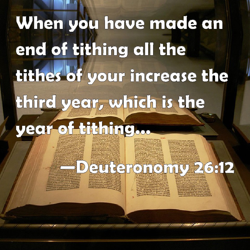 Choose a Background Deuteronomy 26:12 When you have made an end of tithing all the tithes of your increase the third year, which is the year of tithing, and have given it to the Levite, the stranger, the fatherless, and the widow, that they may eat within your gates, and be filled; KJV: When thou hast made an end of tithing all the tithes of thine increase the third year, which is the year of tithing, and hast given it unto the Levite, the stranger, the fatherless, and the widow, that they may eat within thy gates, and be filled; DRB: When thou hast made an end of tithing all thy fruits, in the third year of tithes thou shalt give it to the Levite, and to the stranger, and to the fatherless, and to the widow, that they may eat within thy gates, and be filled: DBT: When thou hast made an end of tithing all the tithes of thy produce in the third year, the year of tithing, thou shalt give it to the Levite, to the stranger, to the fatherless, and to the widow, that they may eat in thy gates, and be filled; ERV: When thou hast made an end of tithing all the tithe of thine increase in the third year, which is the year of tithing, then thou shalt give it unto the Levite, to the stranger, to the fatherless, and to the widow, that they may eat within thy gates, and be filled; WBT: When thou hast made an end of tithing all the tithes of thy increase the third year, which is the year of tithing, and hast given it to the Levite, the stranger, the fatherless, and the widow, that they may eat within thy gates, and be filled: WEB: When you have made an end of tithing all the tithe of your increase in the third year, which is the year of tithing, then you shall give it to the Levite, to the foreigner, to the fatherless, and to the widow, that they may eat within your gates, and be filled. YLT: 'When thou dost complete to tithe all the tithe of thine increase in the third year, the year of the tithe, then thou hast given to the Levite, to the sojourner, to the fatherless, and to the widow, and they have eaten within thy gates, and been satisfied,Links Deuteronomy 26:12 NIV • Deuteronomy 26:12 NLT • Deuteronomy 26:12 ESV • Deuteronomy 26:12 NASB • Deuteronomy 26:12 KJV • Deuteronomy 26:12 Interlinear • Deuteronomy 26:12 Commentaries • Deuteronomy 26:12 Parallel Texts • Deuteronomy 26:12 Bible Apps • Deuteronomy 26:12 Parallel • Bible Hub |