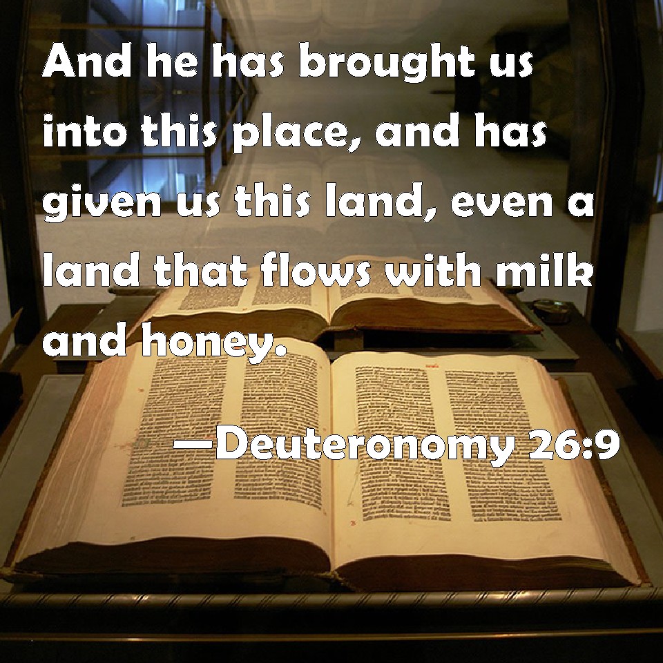 Choose a Background Deuteronomy 26:9 And he has brought us into this place, and has given us this land, even a land that flows with milk and honey. KJV: And he hath brought us into this place, and hath given us this land, even a land that floweth with milk and honey. DRB: And brought us into this place, and gave us this land flowing with milk and honey. DBT: and he hath brought us into this place, and hath given us this land, a land flowing with milk and honey! ERV: and he hath brought us into this place, and hath given us this land, a land flowing with milk and honey. WBT: And he hath brought us into this place, and hath given us this land, even a land that floweth with milk and honey. WEB: and he has brought us into this place, and has given us this land, a land flowing with milk and honey. YLT: and he bringeth us in unto this place, and giveth to us this land — a land flowing with milk and honey.Links Deuteronomy 26:9 NIV • Deuteronomy 26:9 NLT • Deuteronomy 26:9 ESV • Deuteronomy 26:9 NASB • Deuteronomy 26:9 KJV • Deuteronomy 26:9 Interlinear • Deuteronomy 26:9 Commentaries • Deuteronomy 26:9 Parallel Texts • Deuteronomy 26:9 Bible Apps • Deuteronomy 26:9 Parallel • Bible Hub |